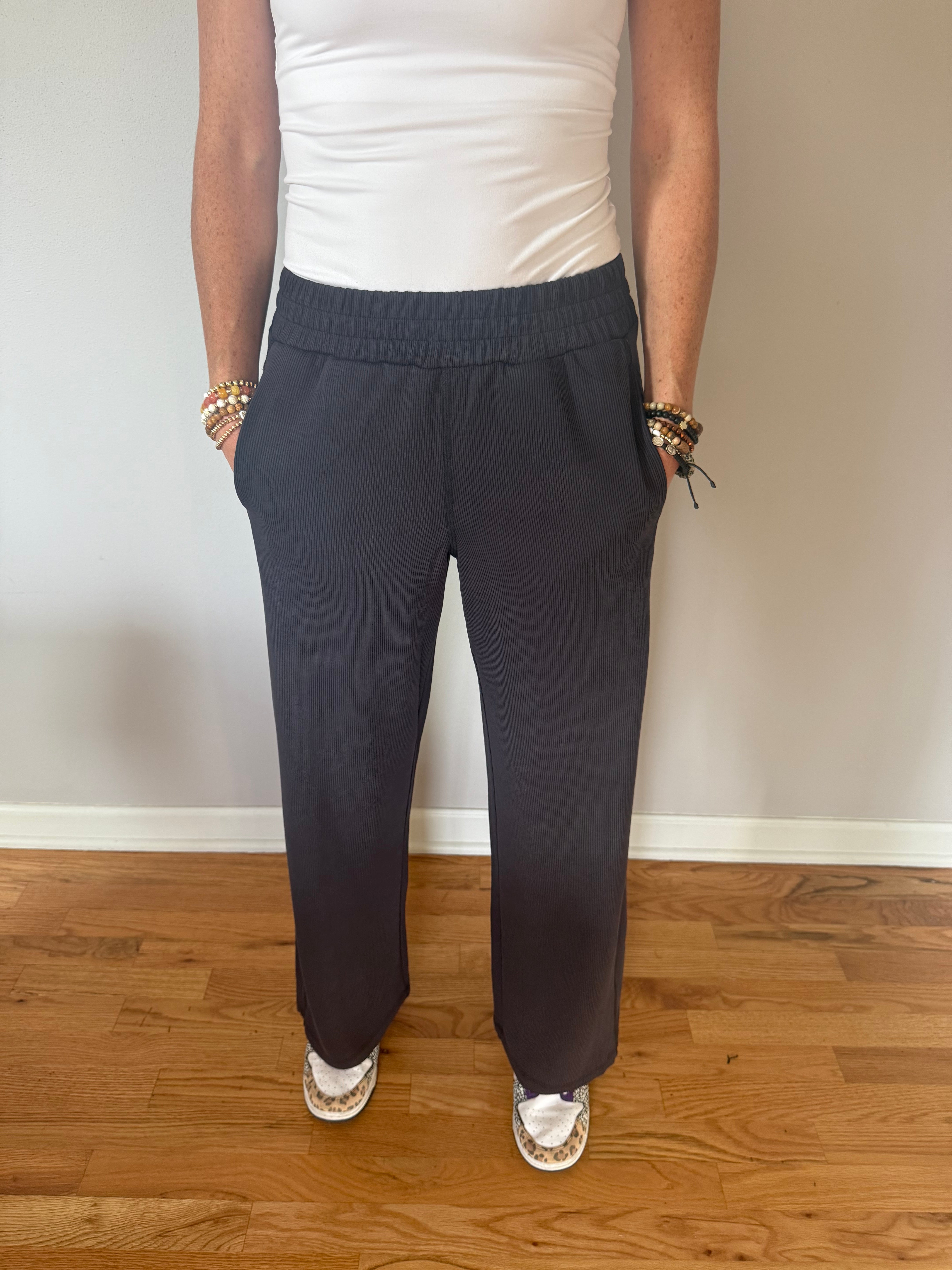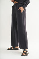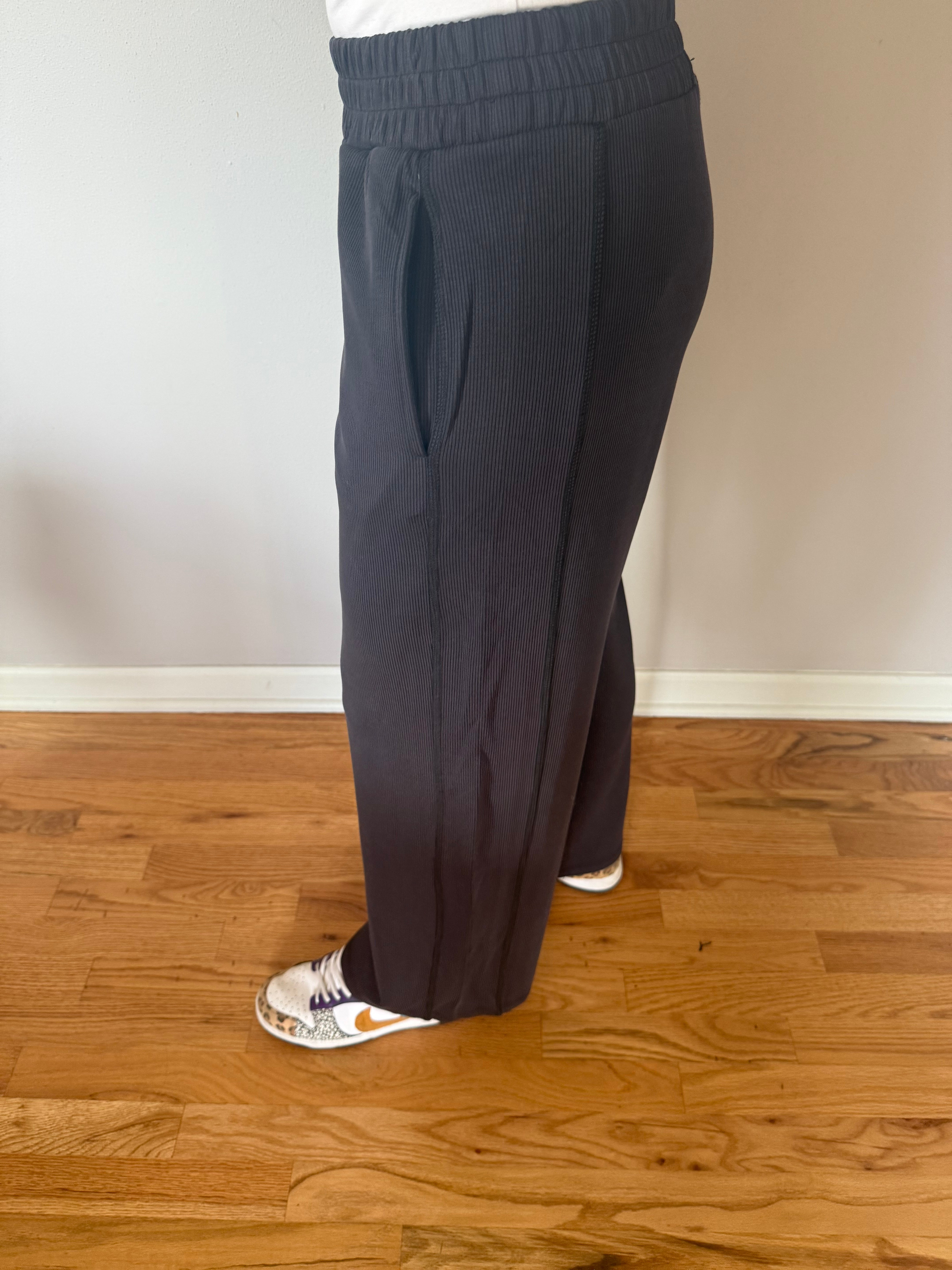 Experience elevated comfort and timeless style with the Luxe Sand Wash Rib Wide-Leg Pants. Made from buttery-soft, sand-washed rib fabric, these pants offer a rich texture and exceptional softness. The elastic waistband ensures a tailored fit, while side seam paneling enhances a long, flattering silhouette.