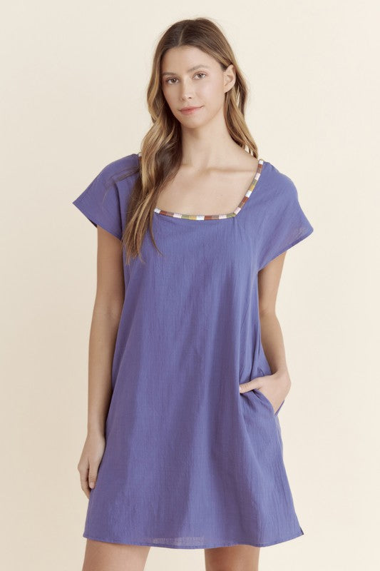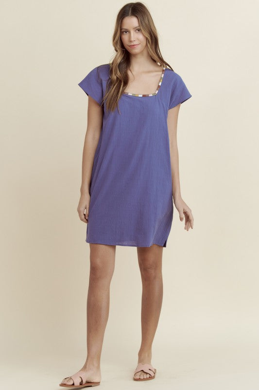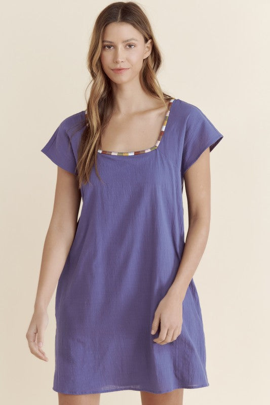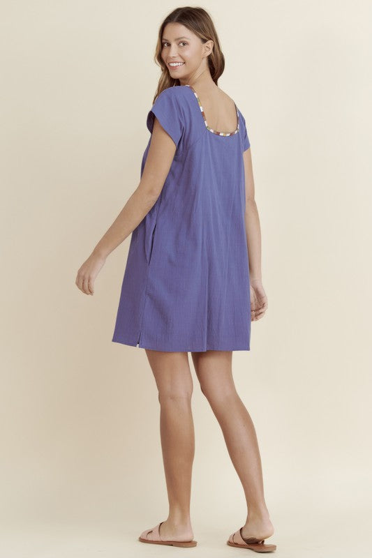 Embroidered Detail Lined Mini Dress with side pockets and side slits.