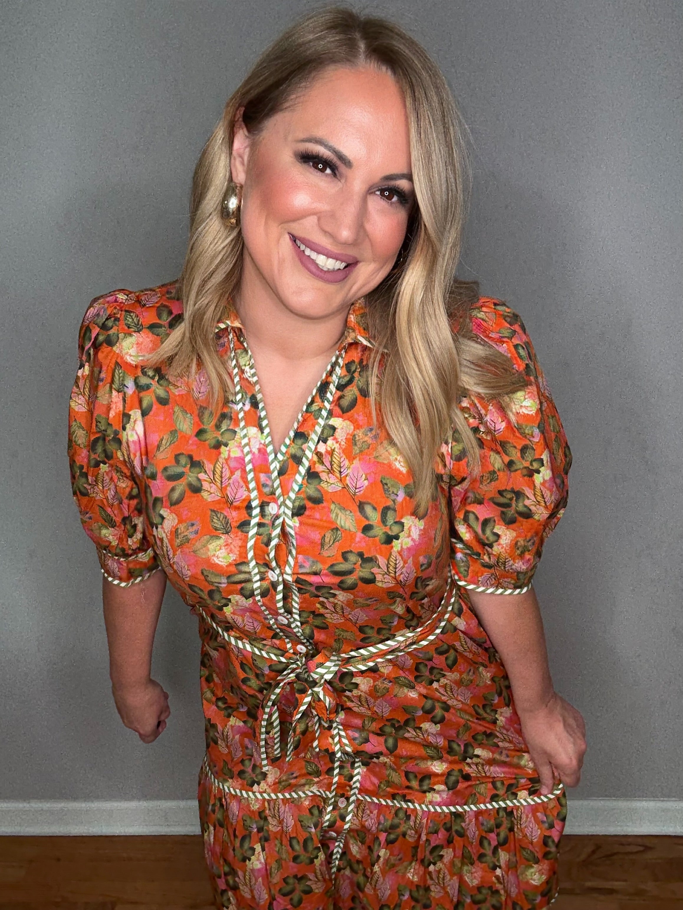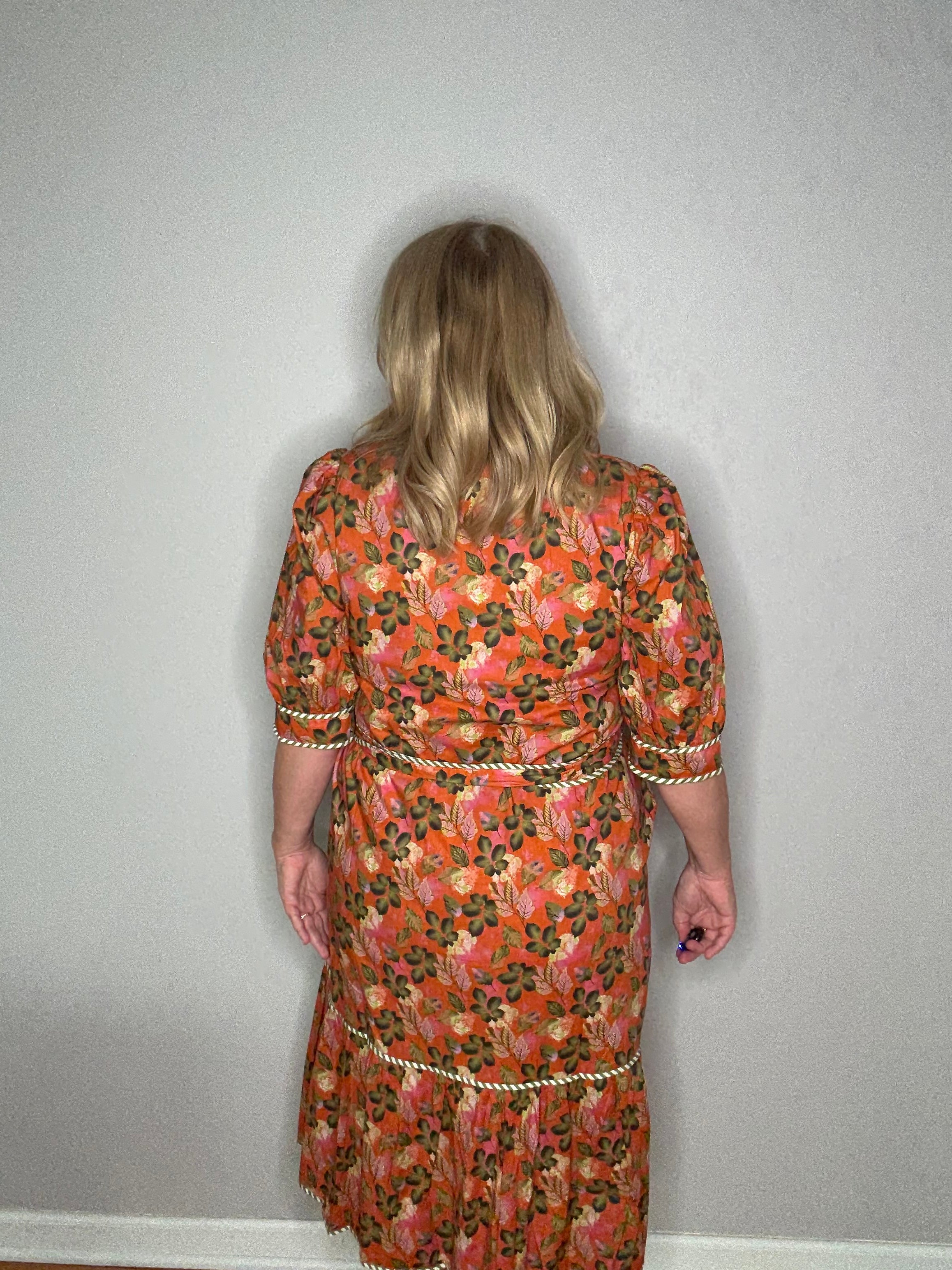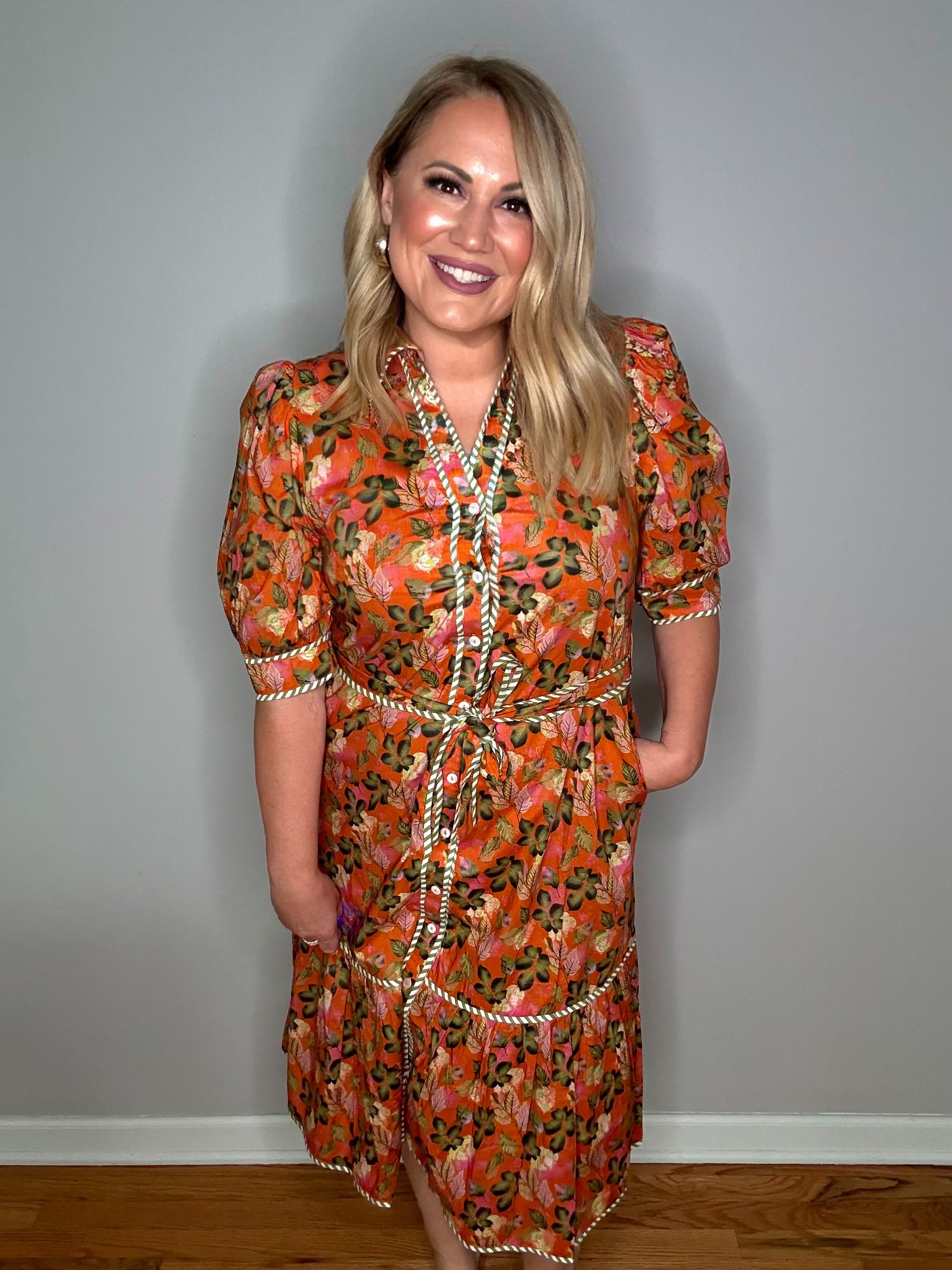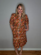 THML Orange Love Button Front Floral Midi Dress