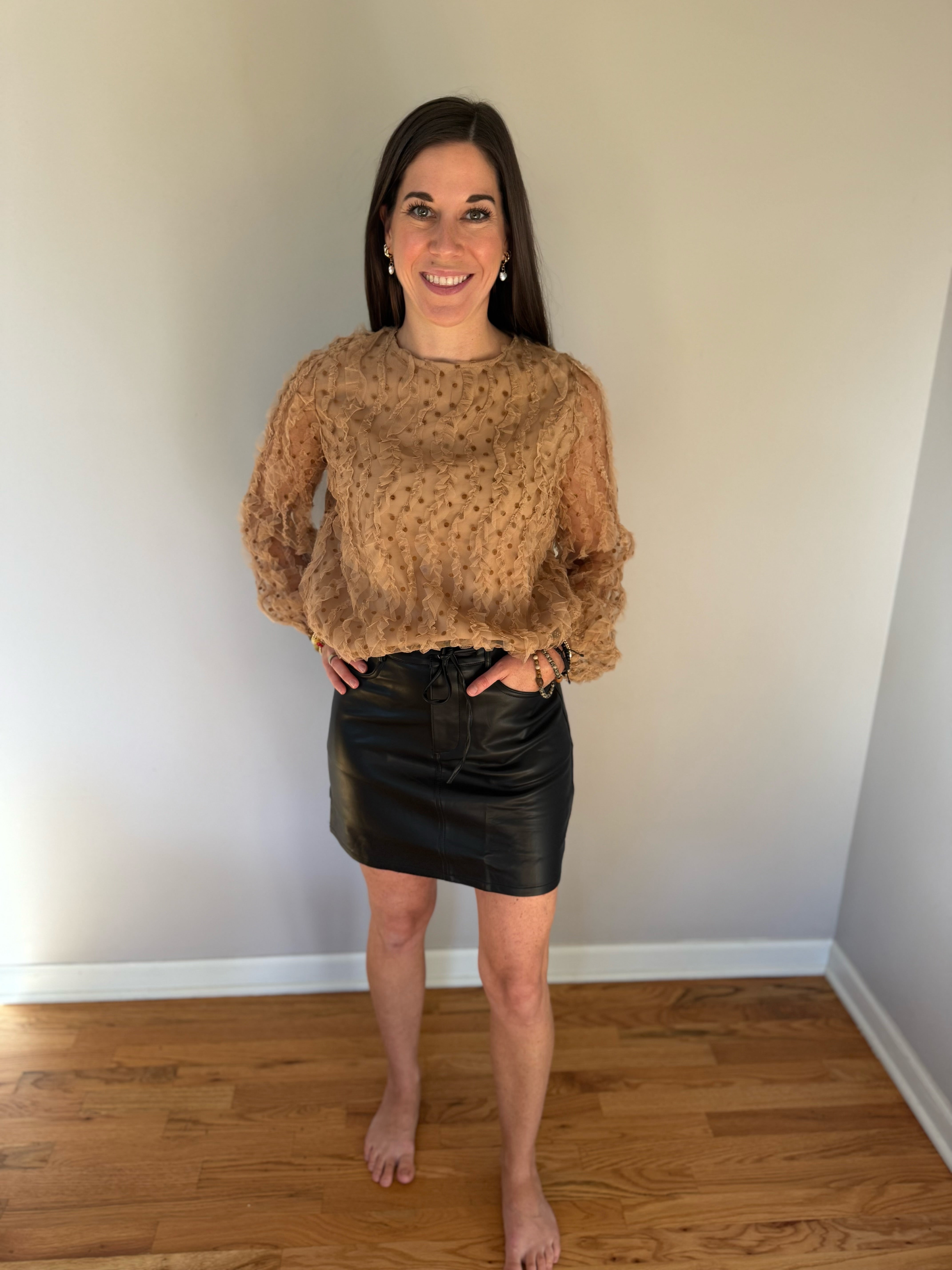 Size Guide: this style comes in sizes Small - Large and runs true to size. Mary is wearing a size small shown. Slight stretch.