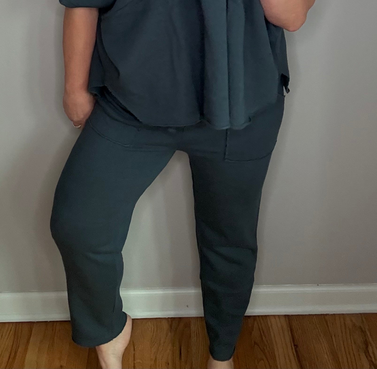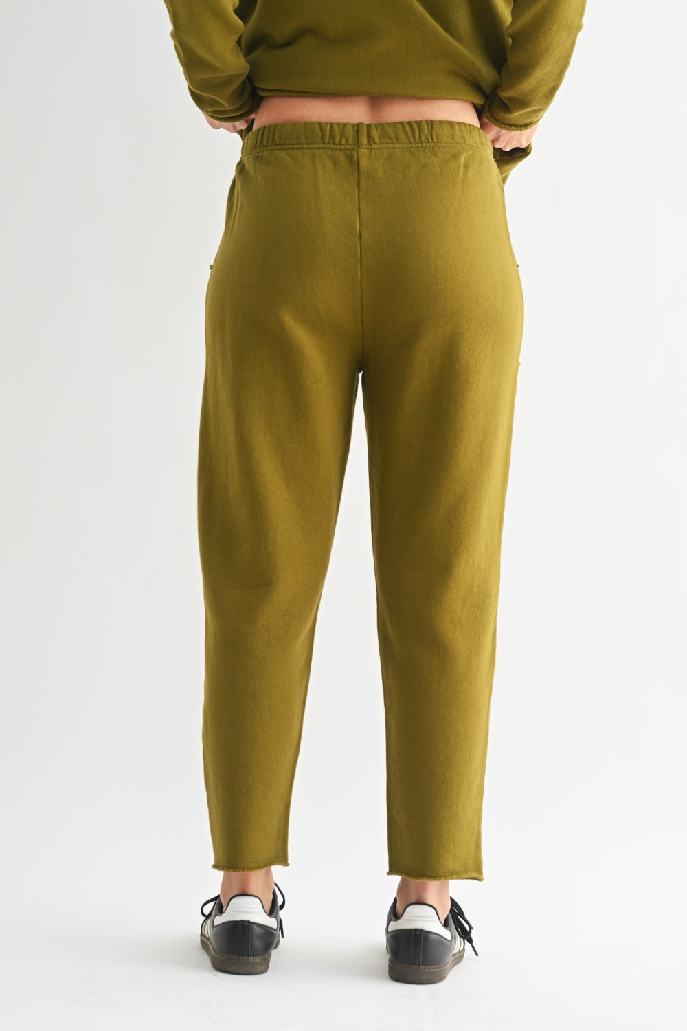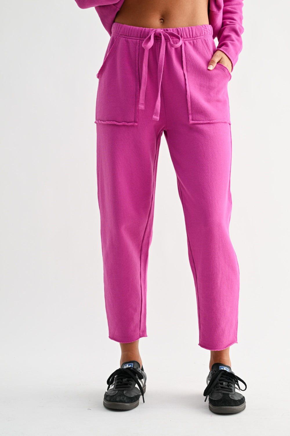 These lounge pants combine comfort and style with an expert touch. Crafted from ultra-soft, garment-washed cotton, they offer a relaxed fit enhanced by a straight leg silhouette and a distinctive tapered raw-edge hem that gently curves around the ankle. Raw-edge patch pockets add subtle detailing, while the adjustable drawstring waistband ensures a personalized fit. Perfect for unwinding or casual outings, these pants deliver effortless wearability with a refined, lived-in aesthetic.