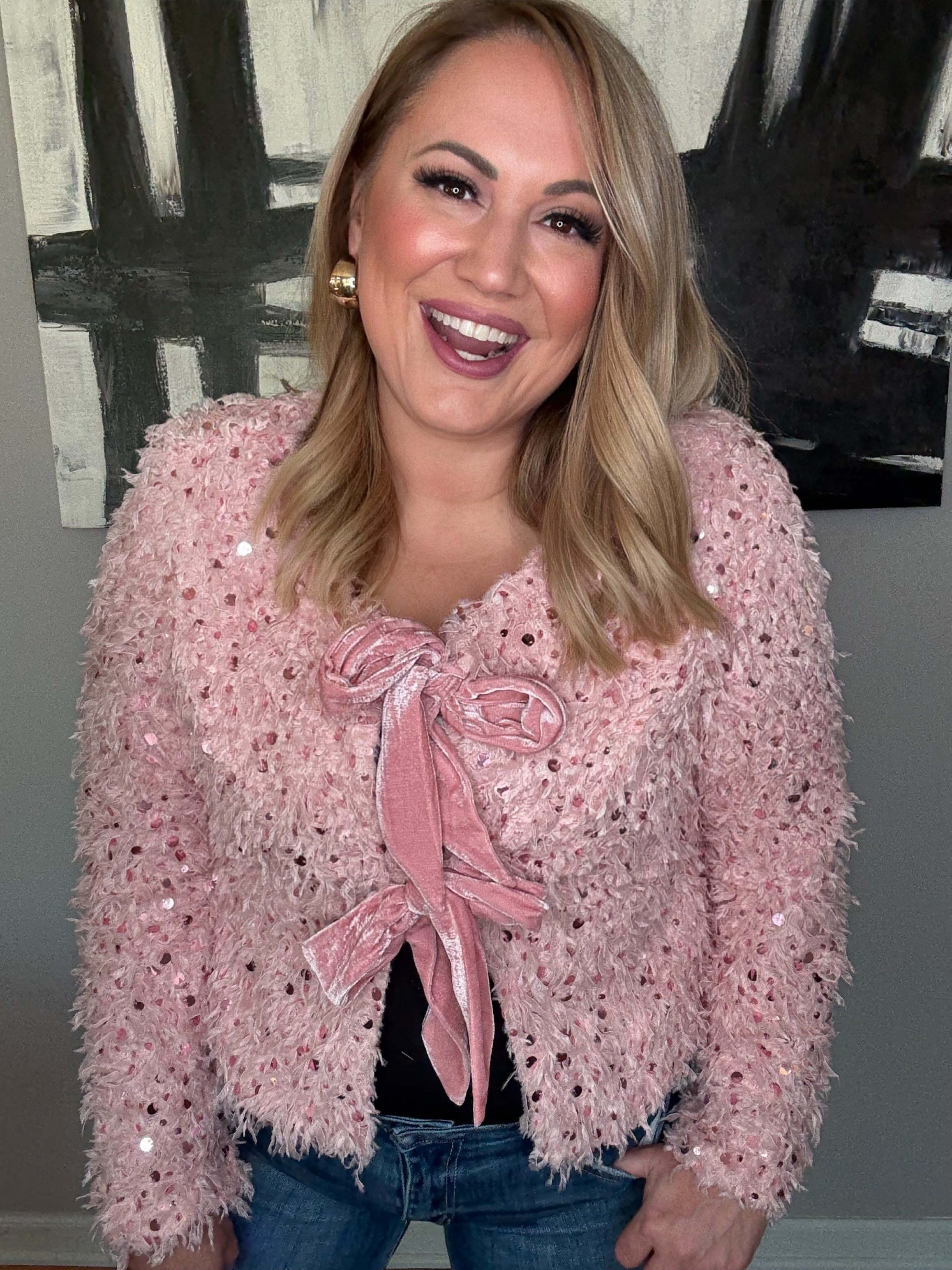 I love this statement piece that I got recently! You can dress it up with a pair of black slacks or dress or down with a pair of jeans and you still will look fabulous! I wore it over my black jumpsuit I bought from Kasey about a year ago and it worked perfectly! It's lightweight but will still keep you warm on a cool evening. Beautiful!