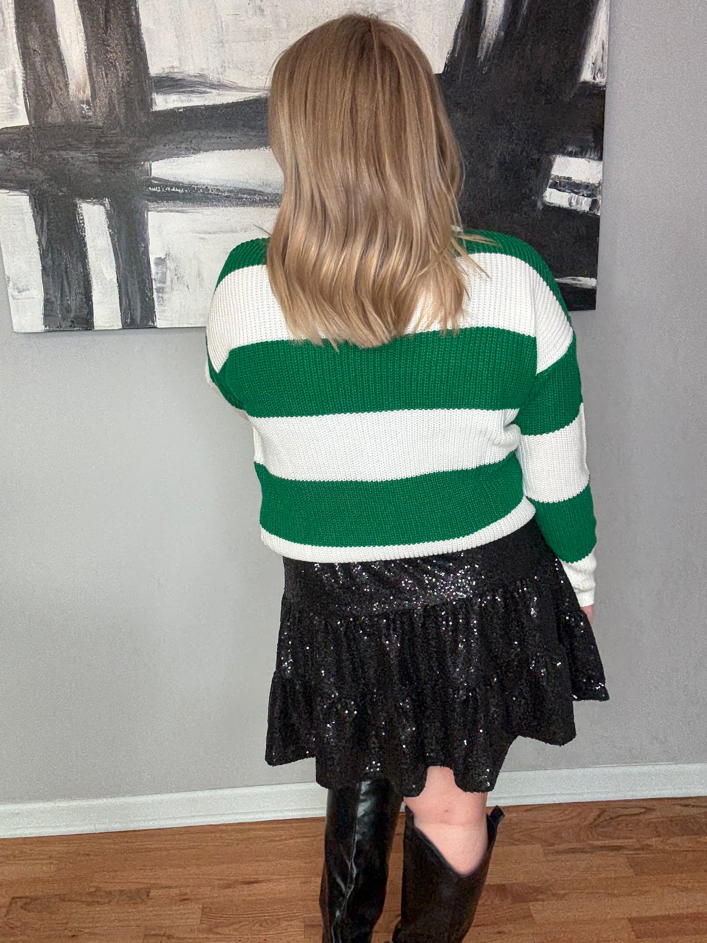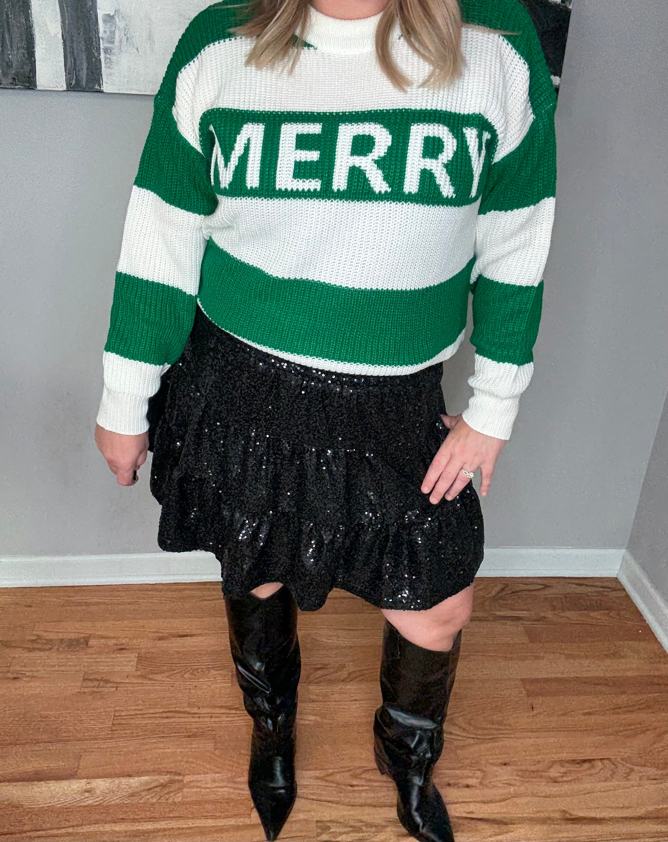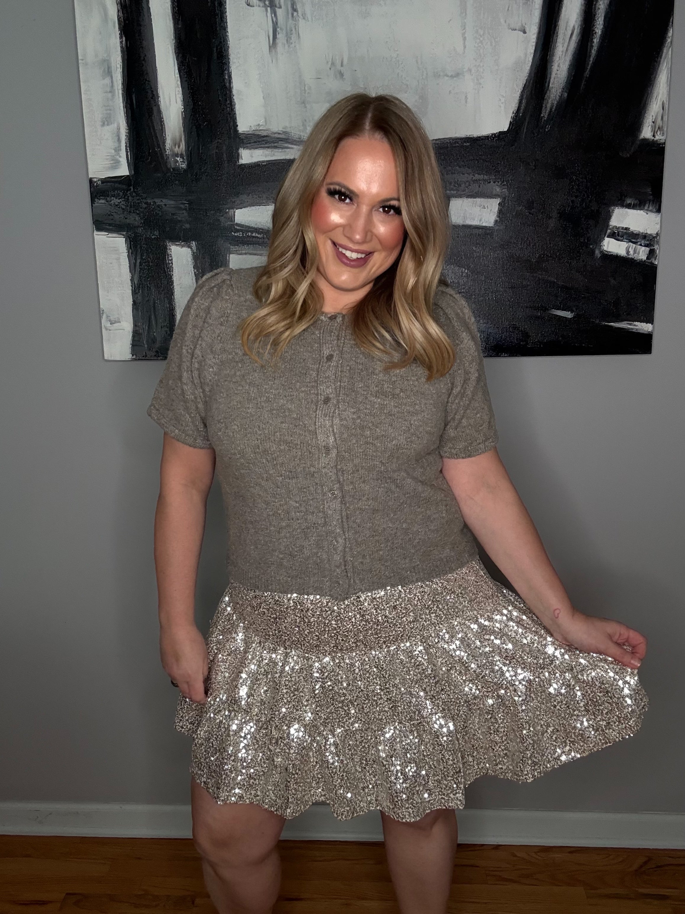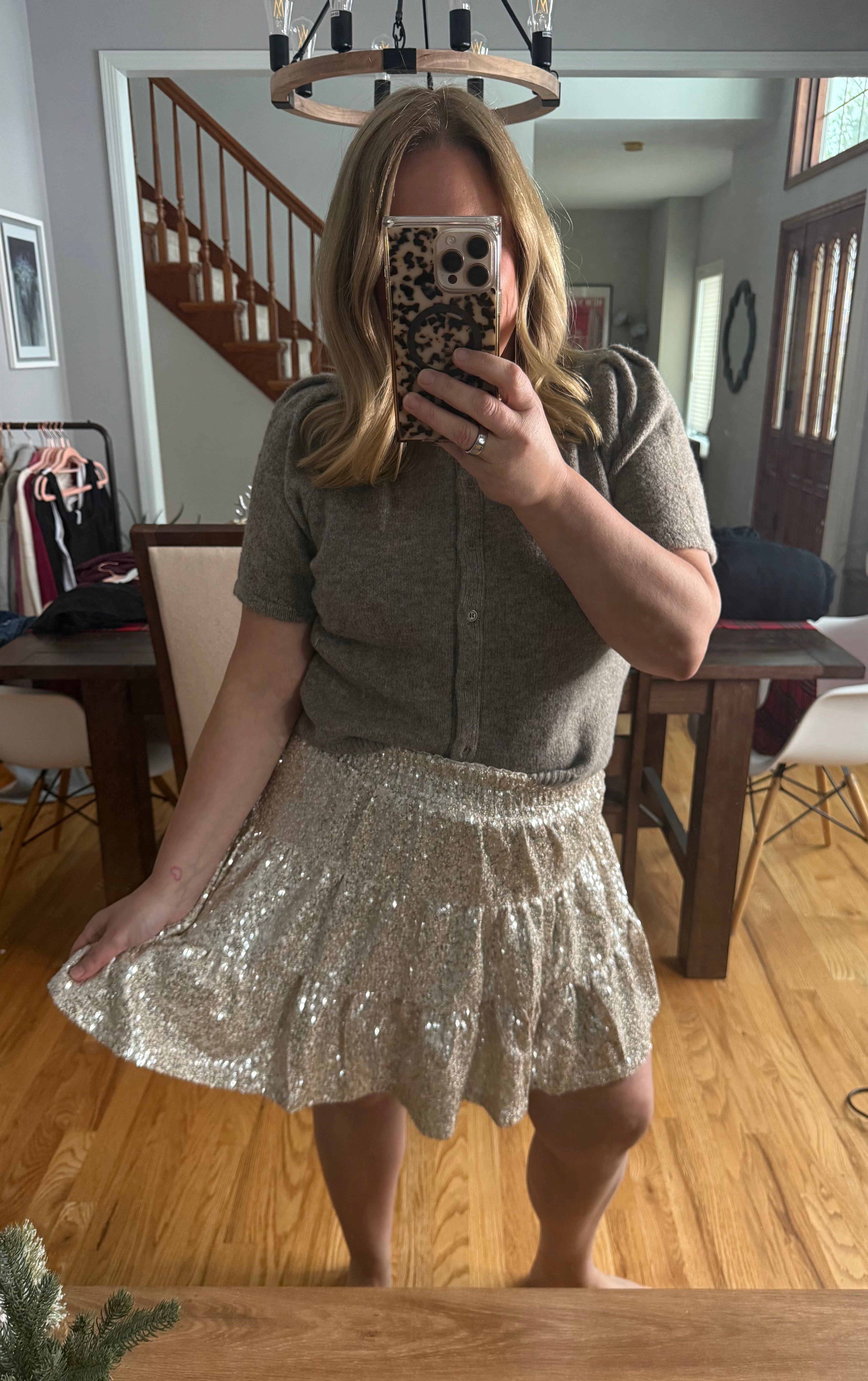 The elastic waist ensures a comfortable, adjustable fit, while the tiered silhouette creates flattering movement and dimension. Crafted from lightweight knit fabric with a full lining, this piece offers coverage without bulk. The solid sequin finish delivers understated glamour perfect for evening occasions or elevated casual wear.