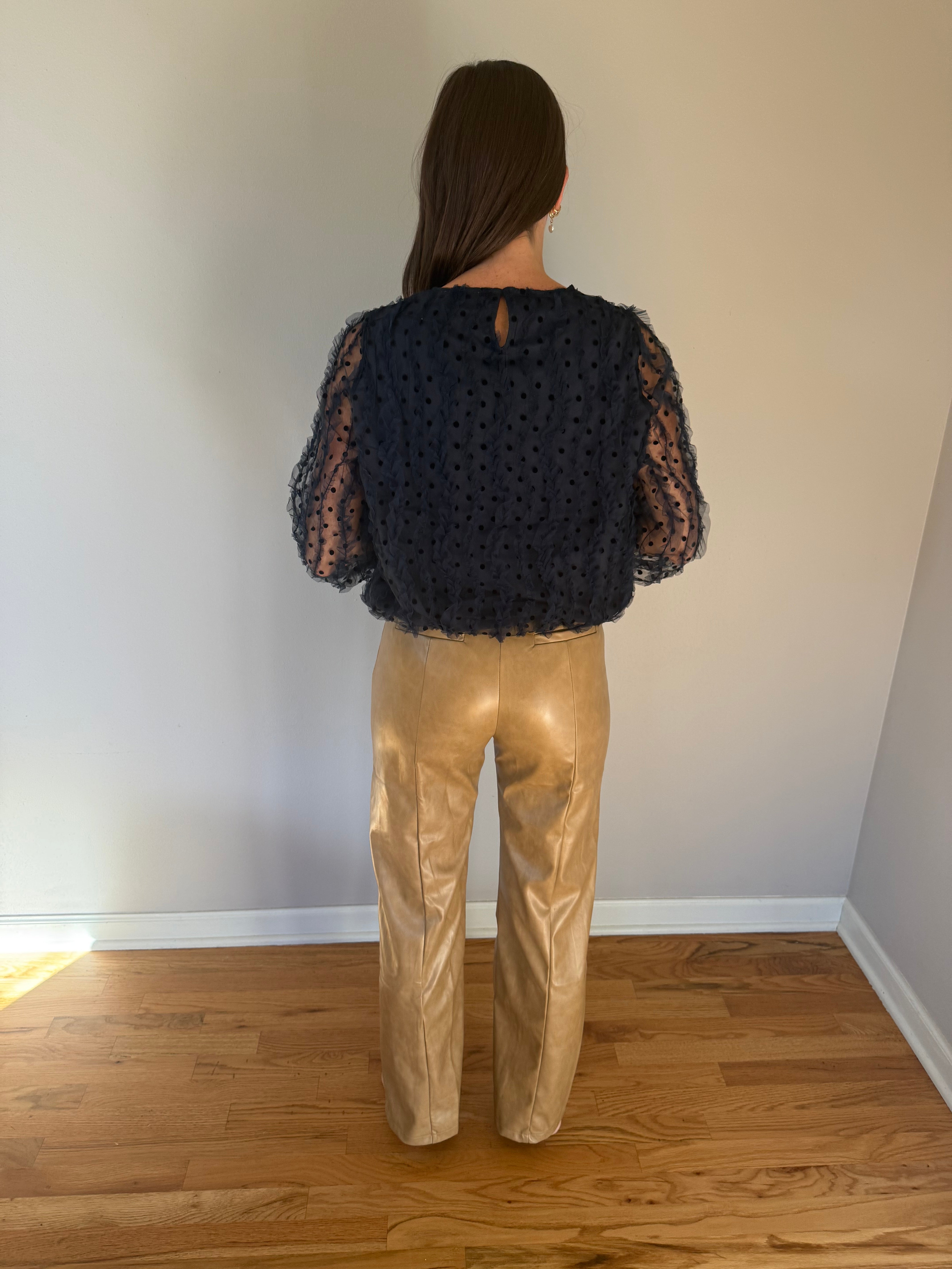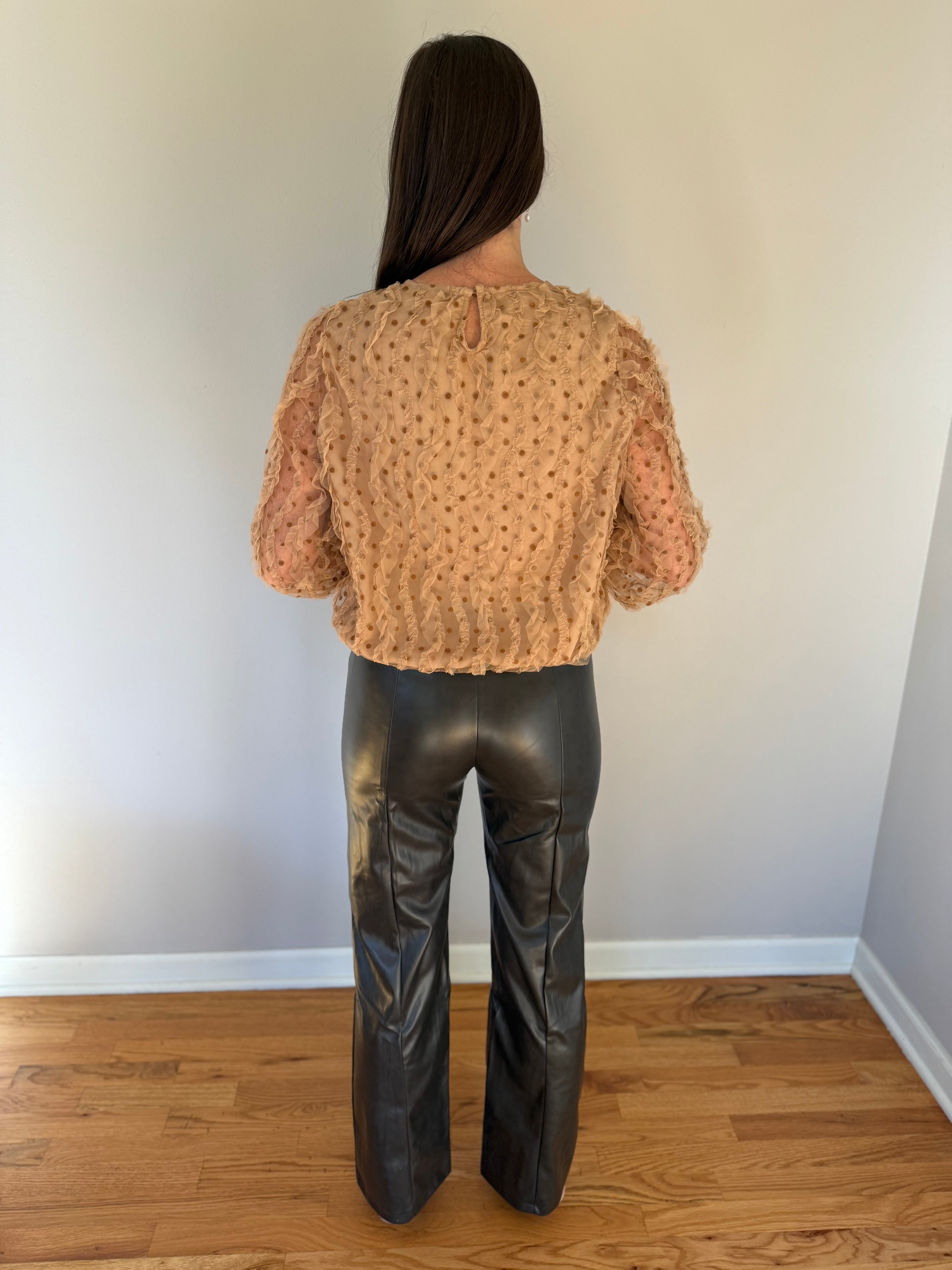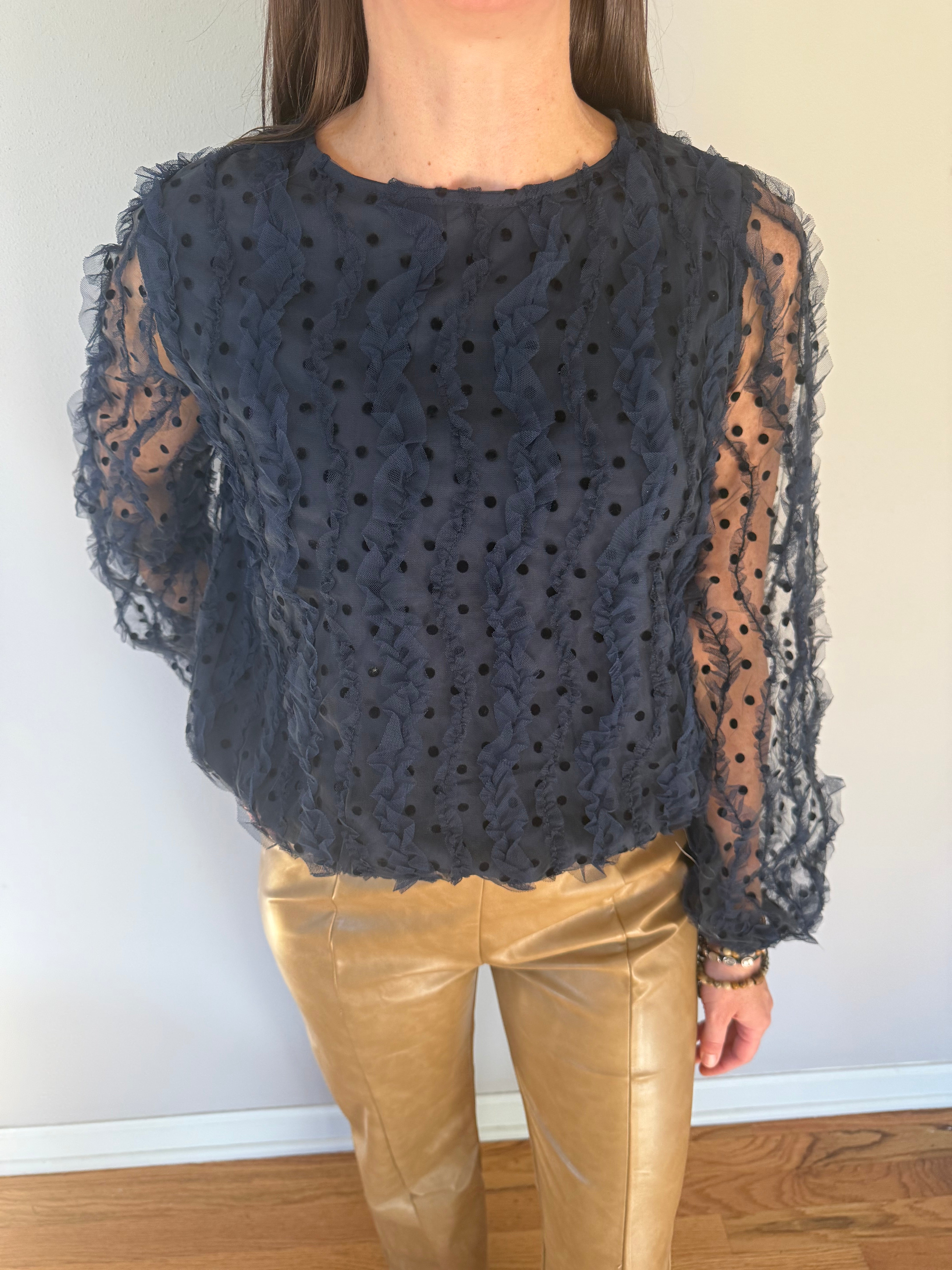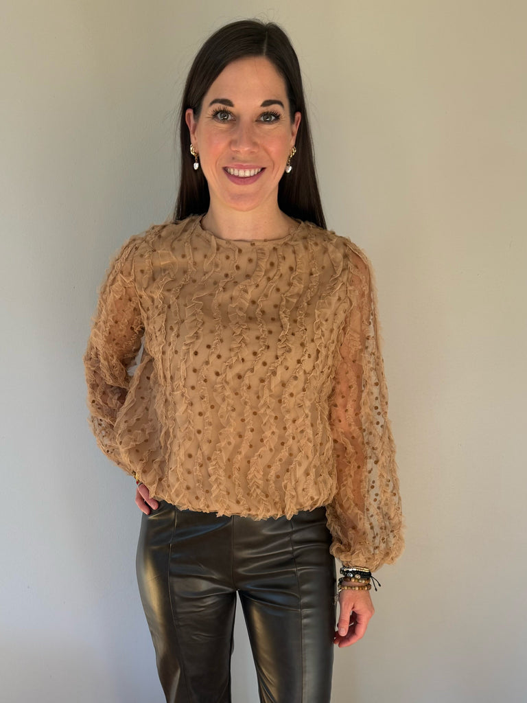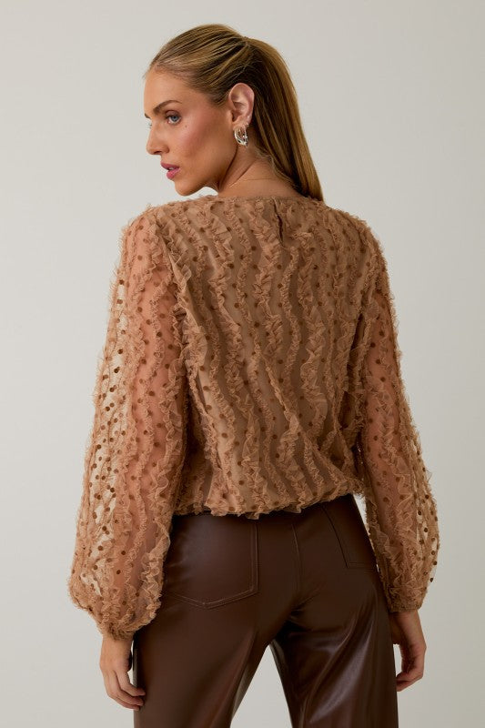 Cropped Round Neck Long Sleeve Texture Mesh Blouse