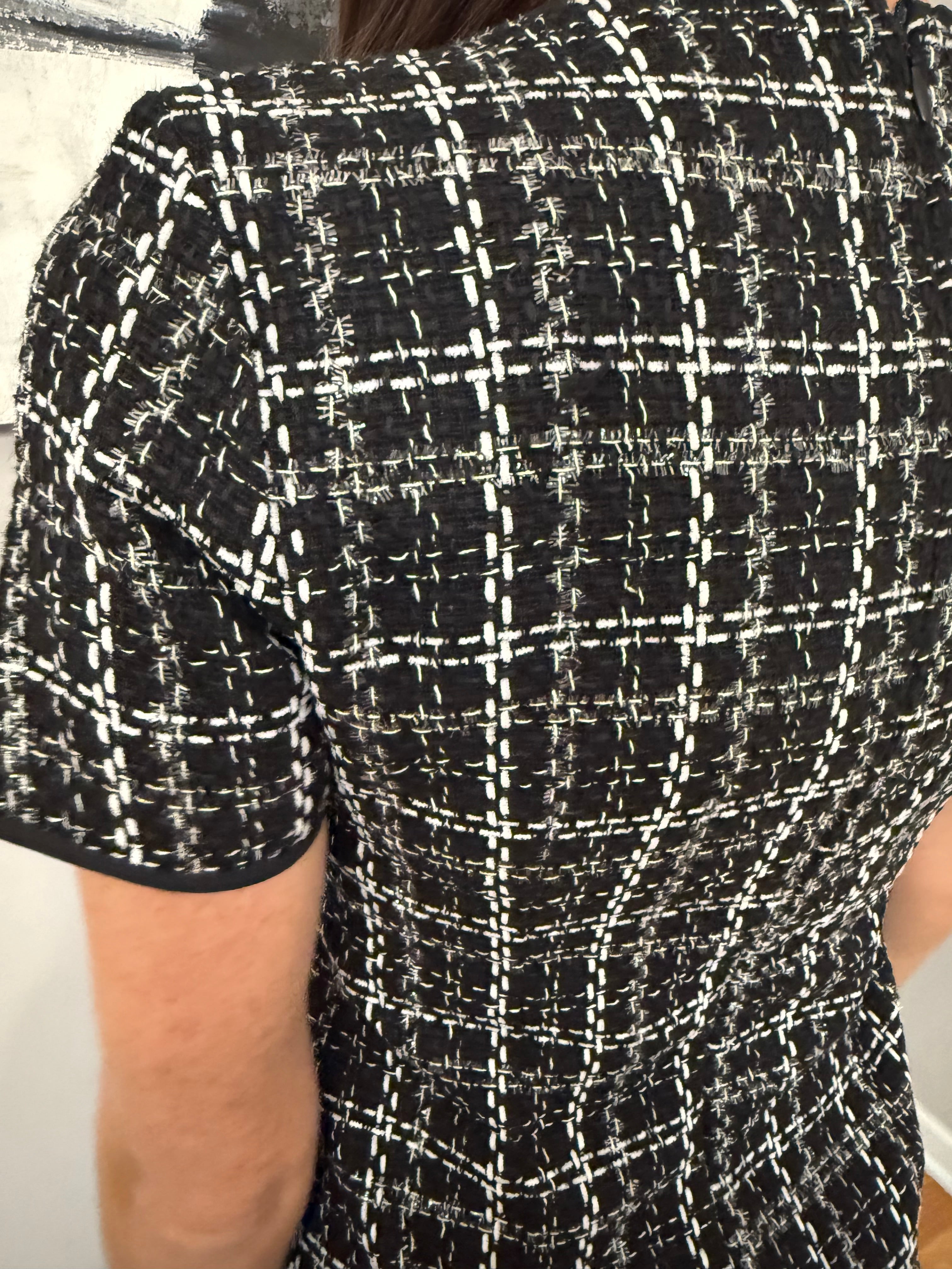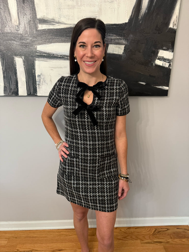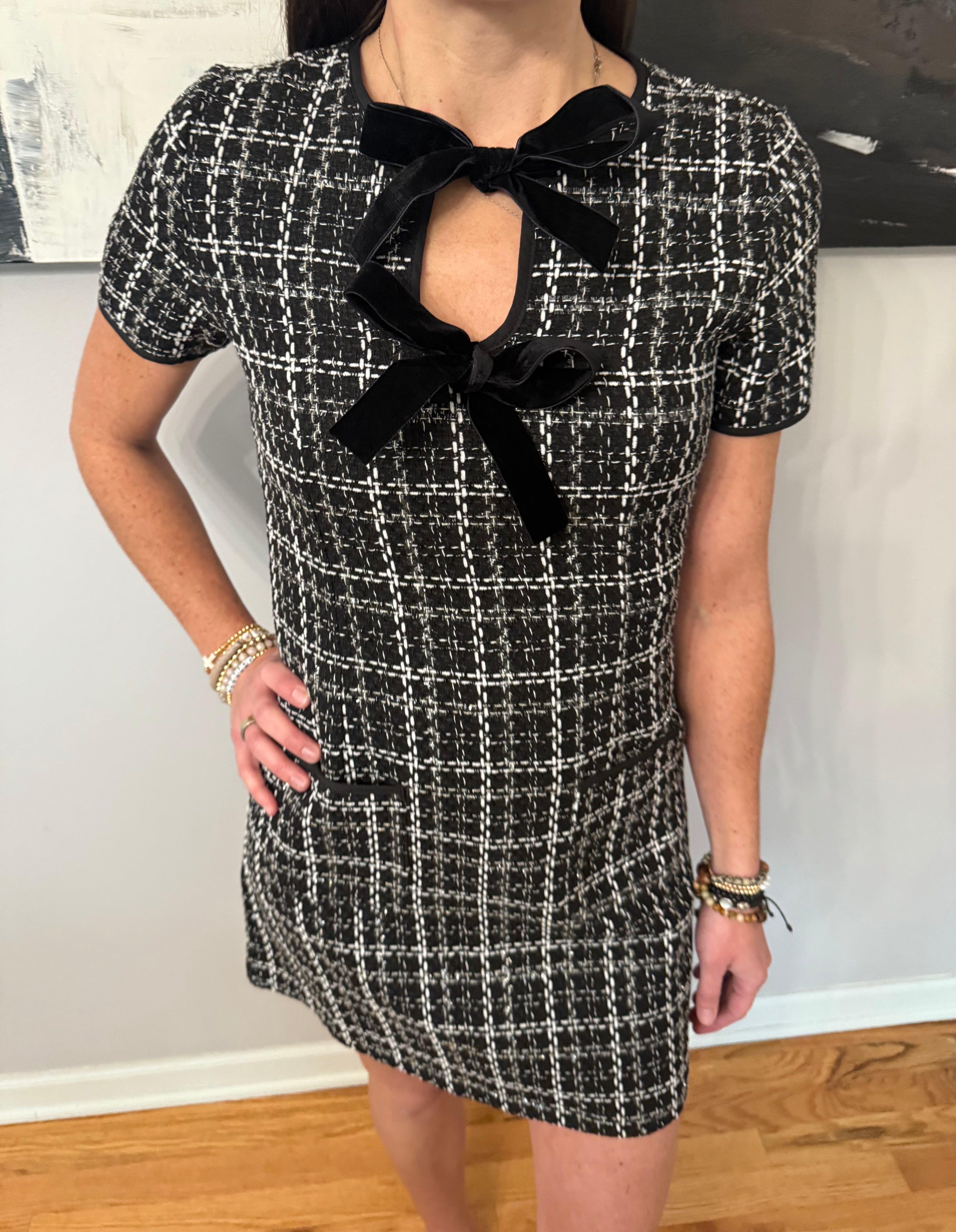 Plaid Tweed Velvet Bow Detail Mini Dress