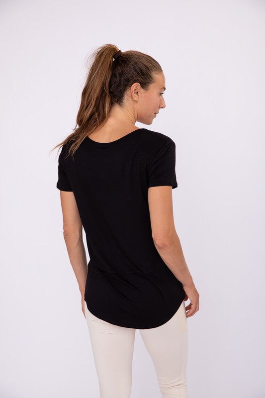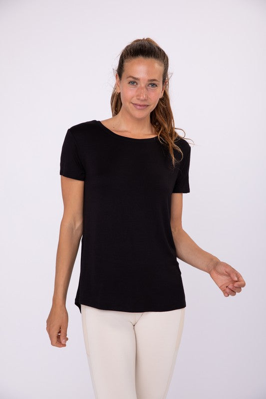 This tee is cute and simple with a slight high-low bottom trim. Super soft and stretchy.