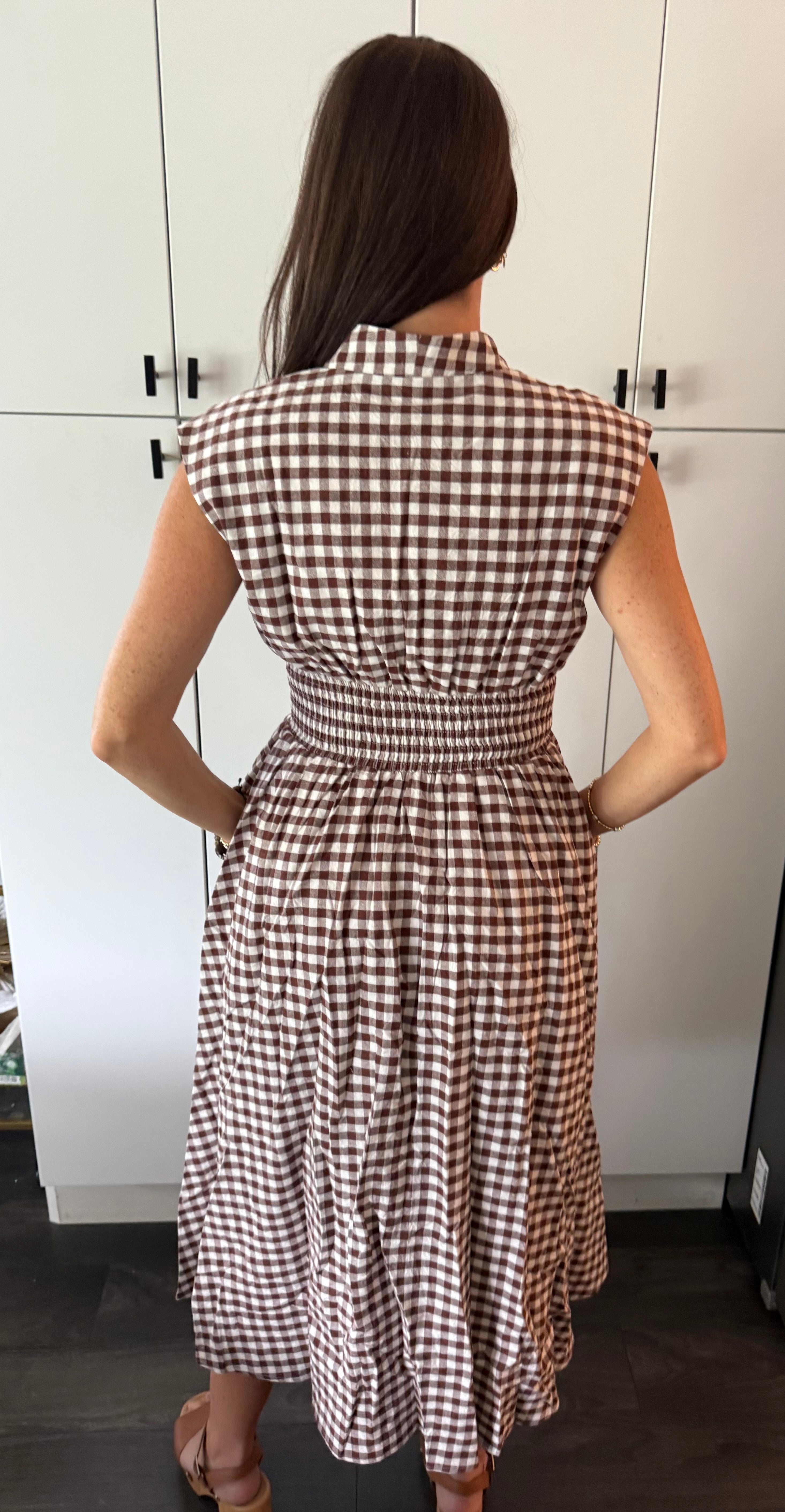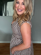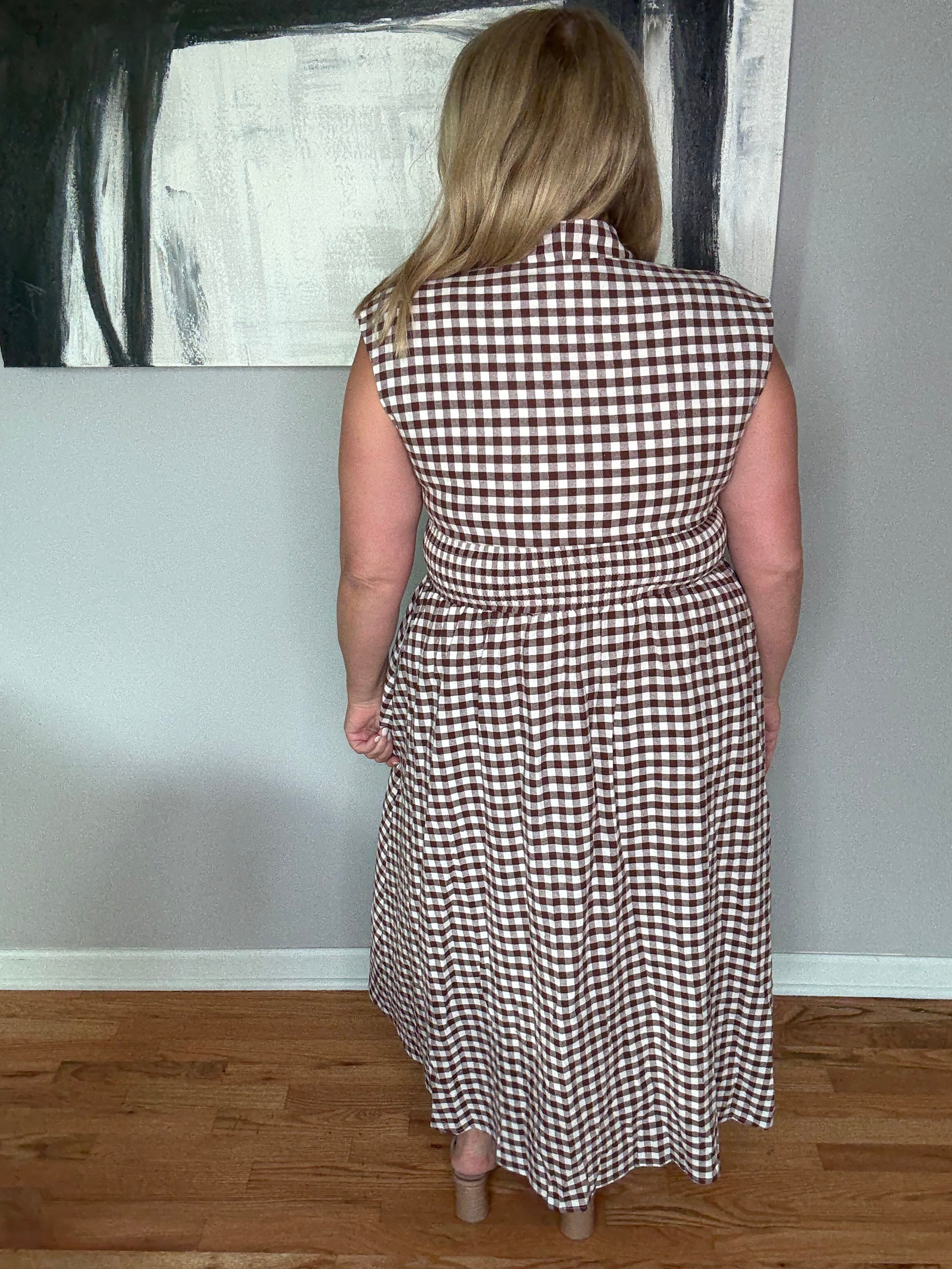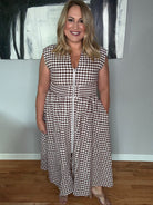 Chocolate Gingham Pattern V-neck Sleeveless Midi Dress