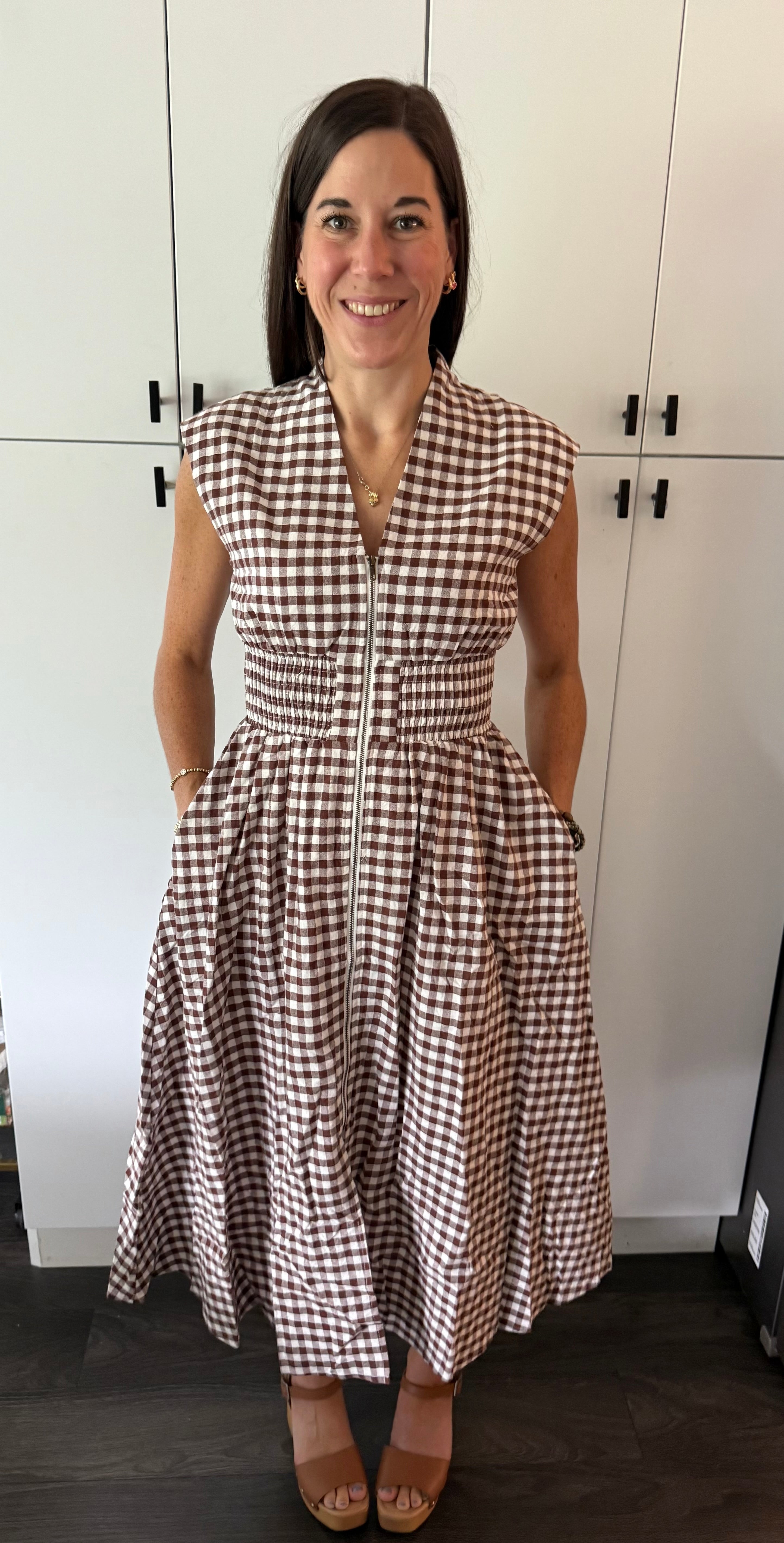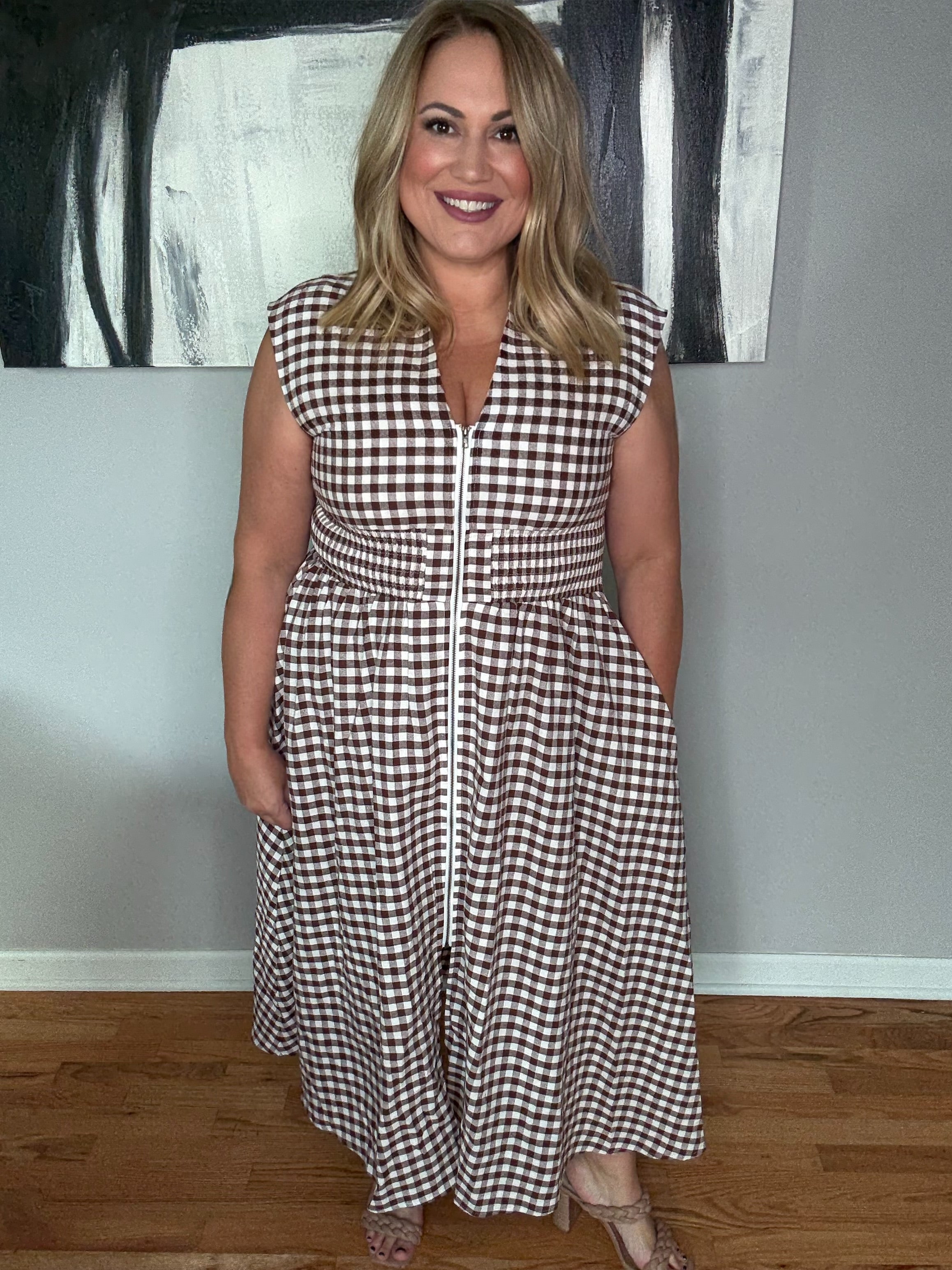 Gingham pattern V-neck sleeveless midi dress featuring a functional zipper closure at front. Smocking at waist. Pocket at sides. Lined. Woven. Non-sheer. Lightweight.