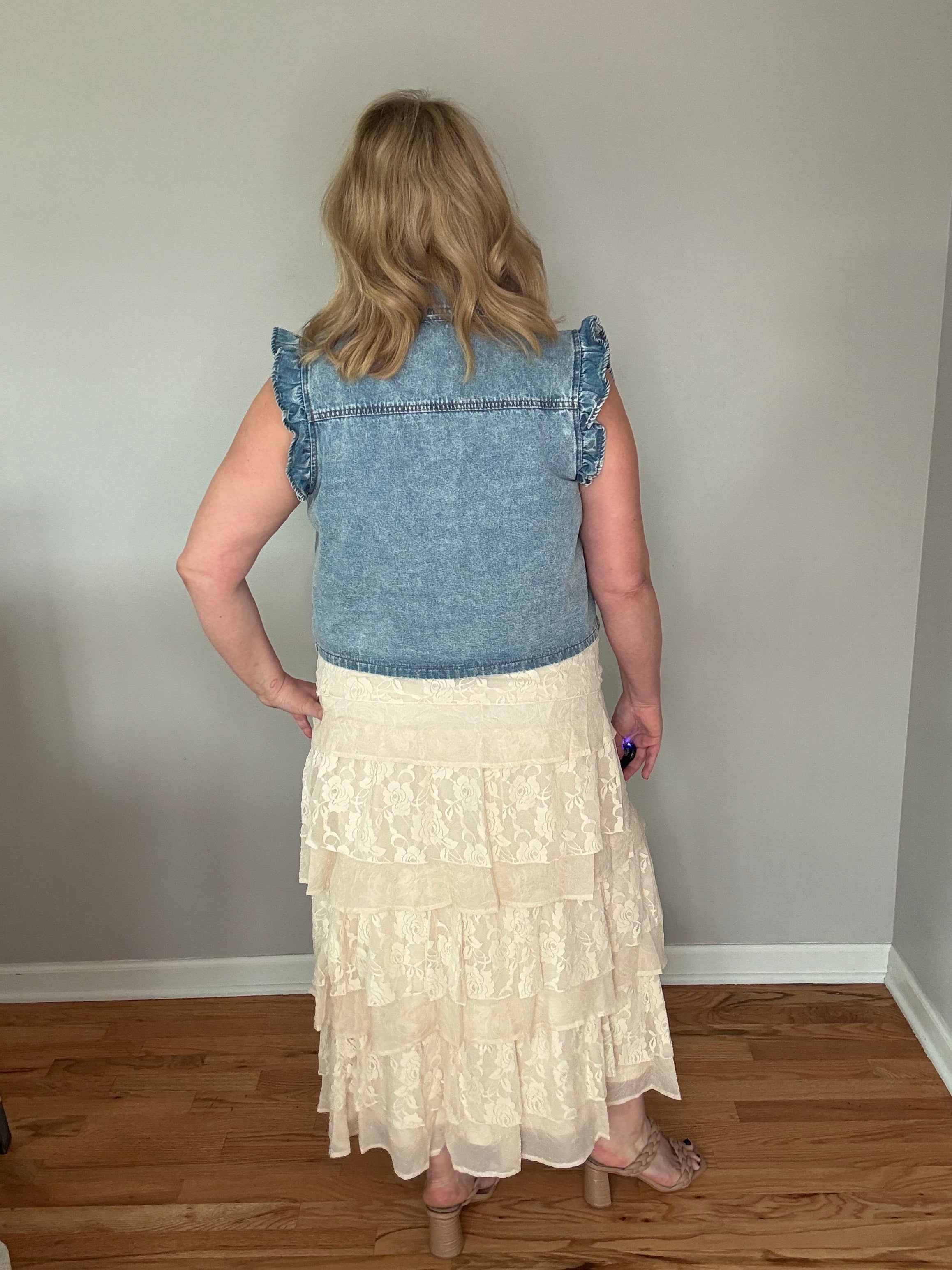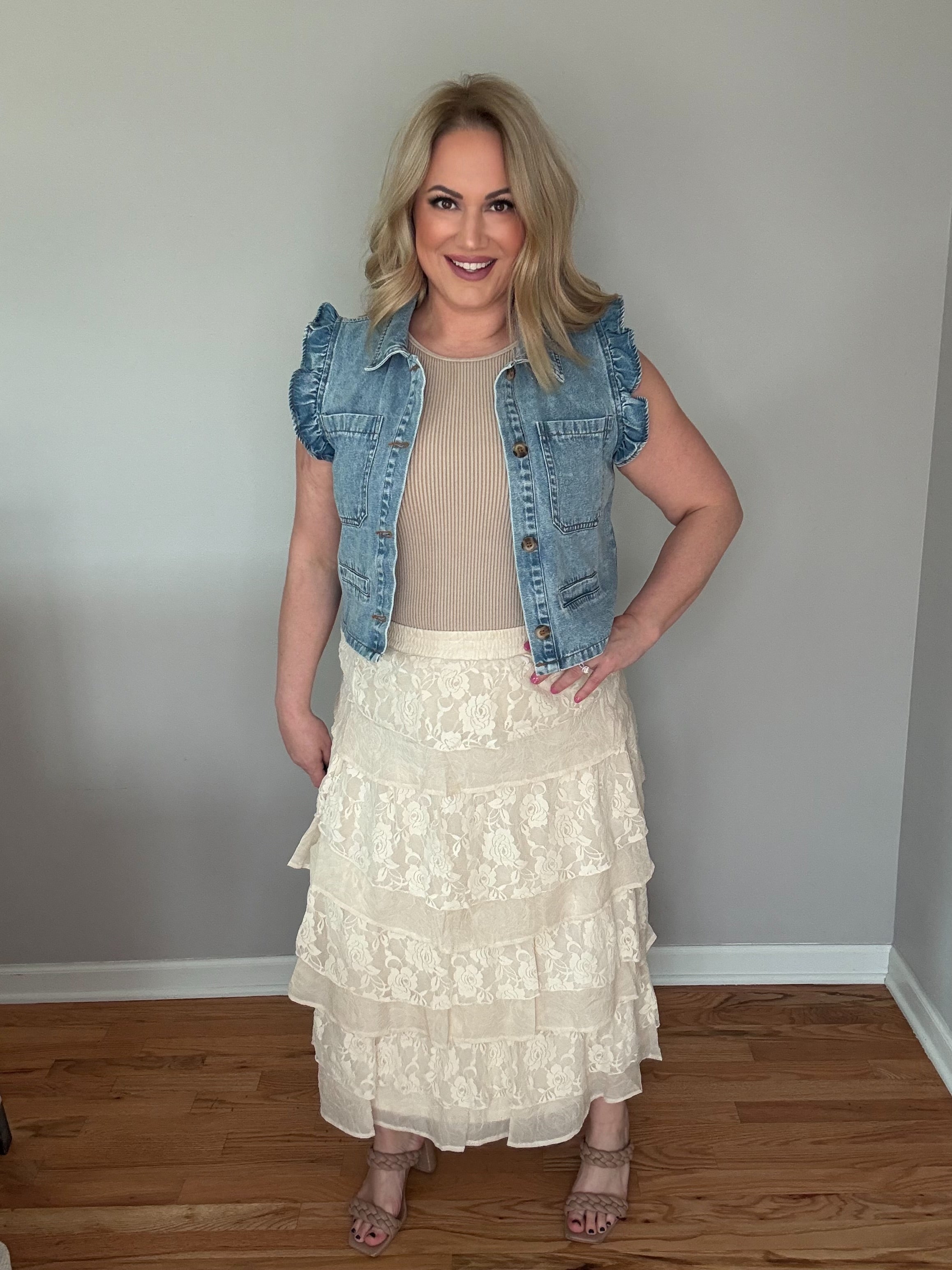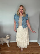 Expertly crafted with all-over delicate floral lace, our Cream Floral Lace Tiered Skirt exudes elegance and femininity. Its tiered ruffle design creates a voluminous and graceful silhouette, while the elasticized waistband offers a secure and comfortable fit for all-day wear. Fully lined with a flowy maxi length, this skirt is perfect for a sophisticated and dramatic look.