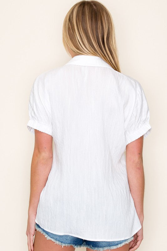 Crinkle V Neck Elastic Arm Top