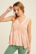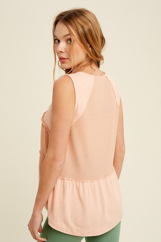 Sleeveless knit top with mixture of fabrication of thermal and felt soft fabric. It is amazing!! Elastic button closure at the bust, raw edge detailing throughout garment.