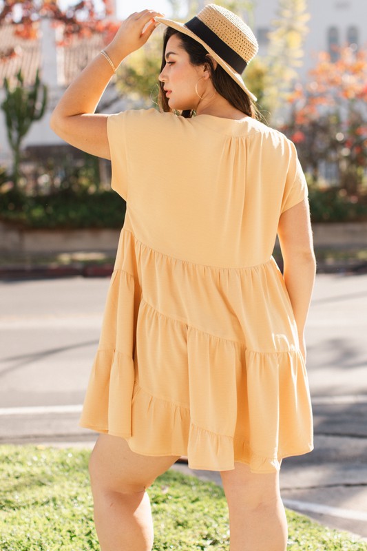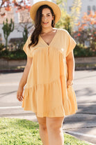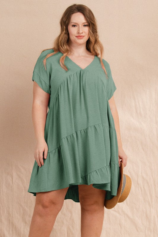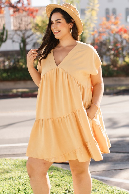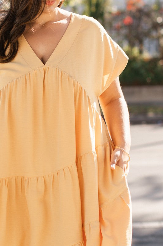 Solid textured woven Dress Featuring a V- Neckline, Drop shoulder, gathered waist and side pockets.