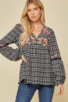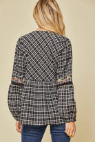 This top is so perfect for fall. Pair with distressed denim, black denim and cute brown booties. Add a bun and coffee and you are ready to go to any fun fall event!