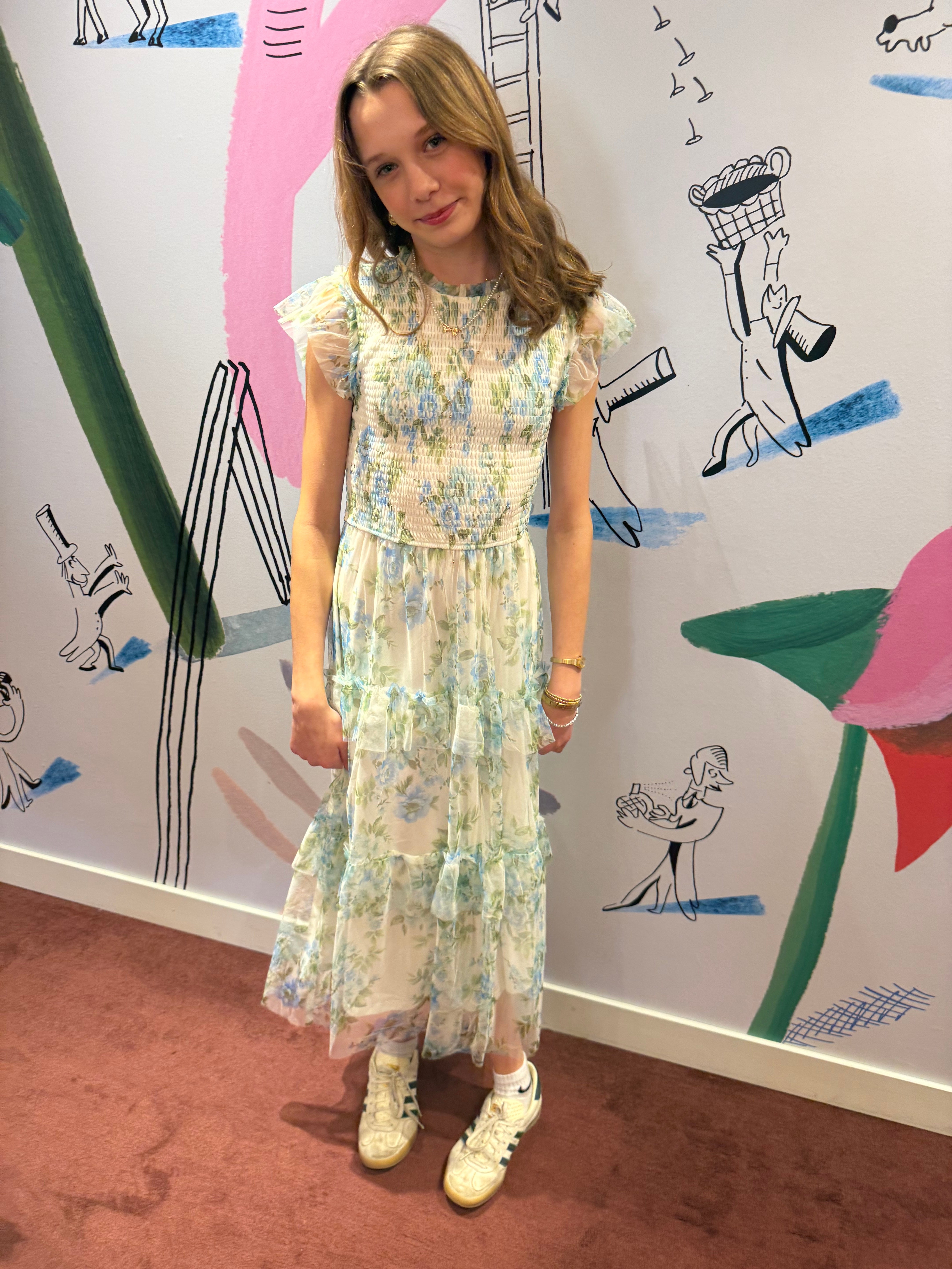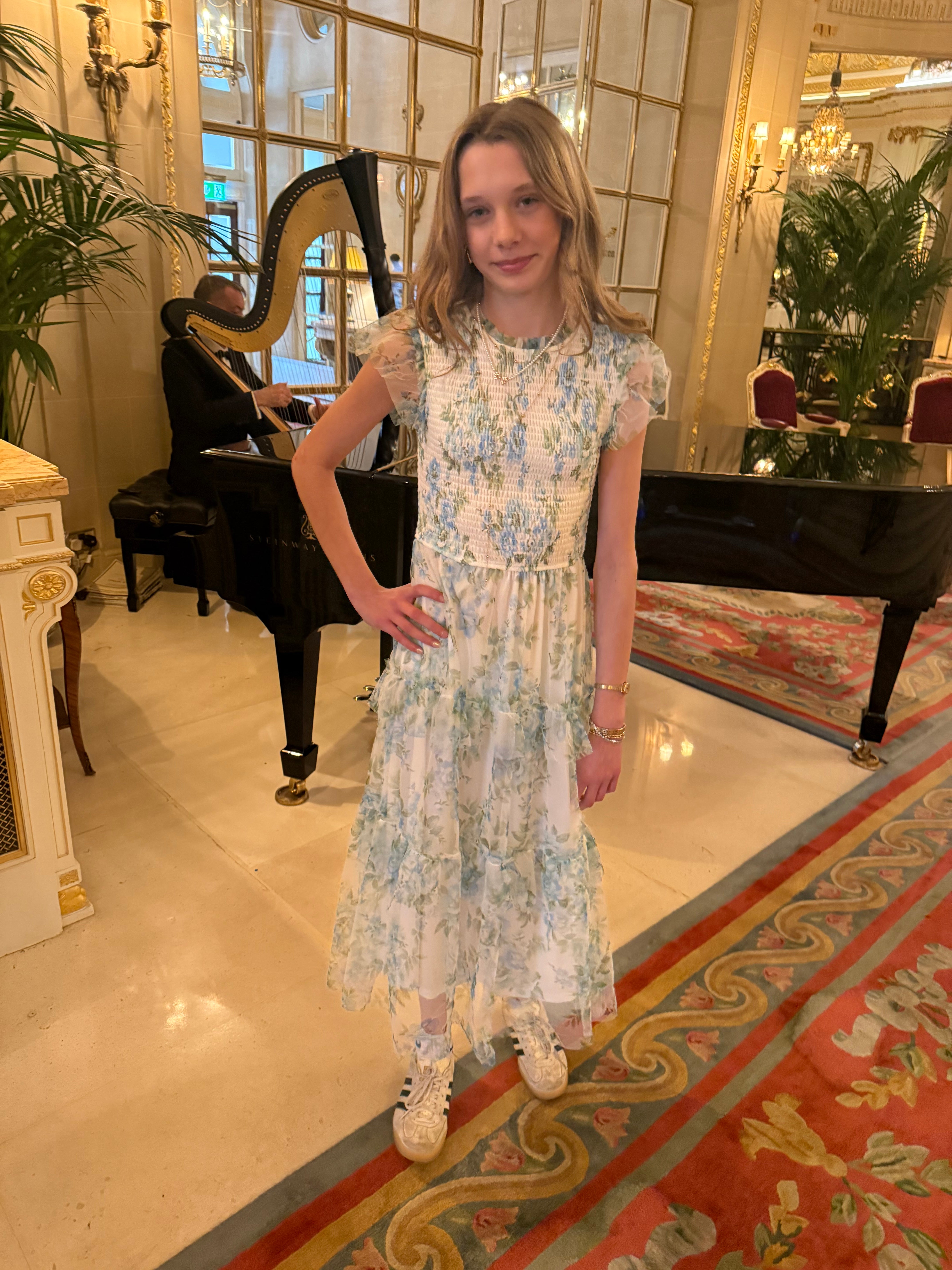 Size Guide: this style comes in sizes Small - Large and runs true to size. Violet is typically a size XS/S. Top is smocked and has stretch to adjust to various top sizes.