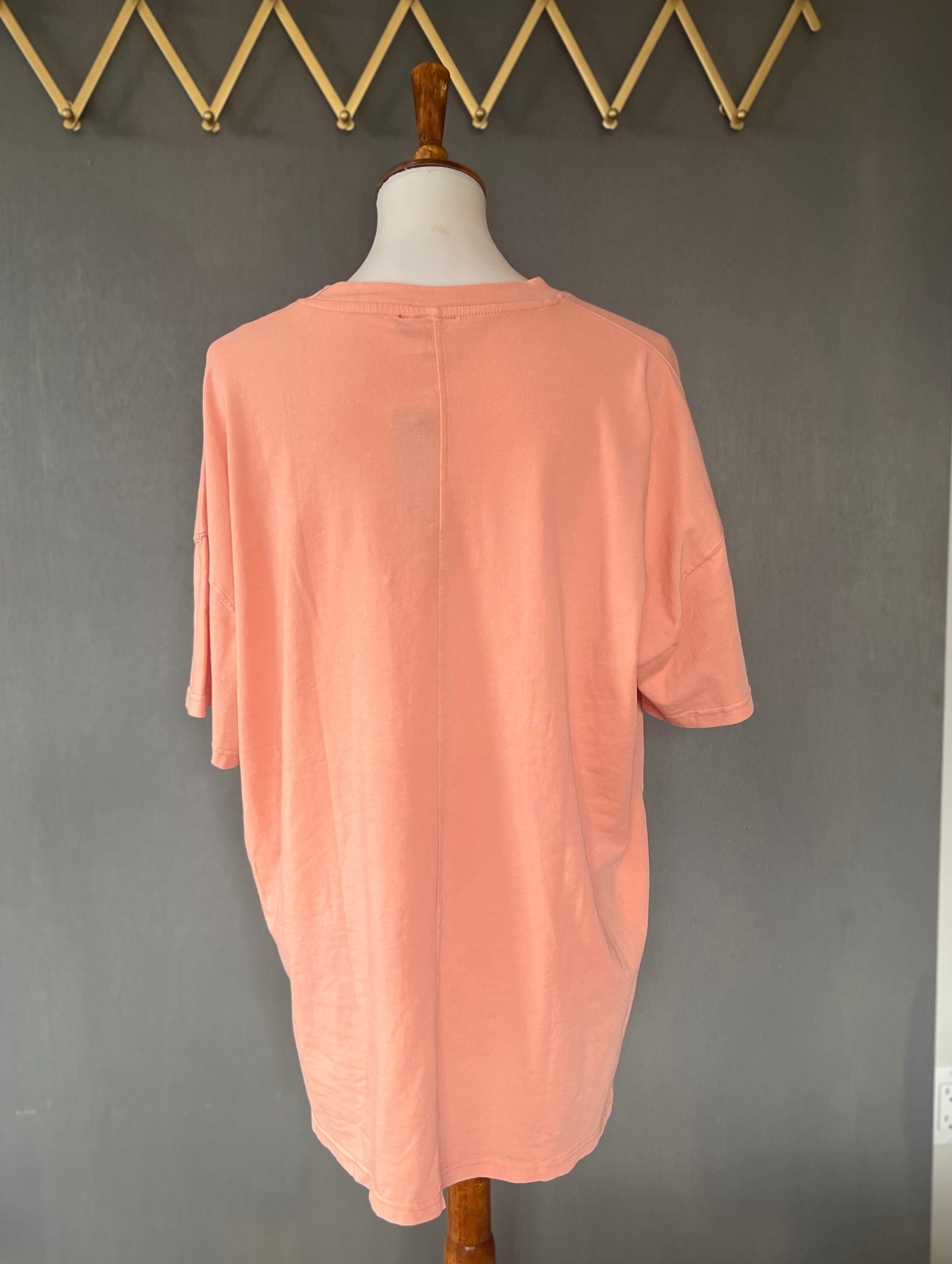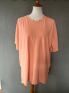 Amazing quality tee! Comfortable side slits and featuring a high-low bottom hem.
