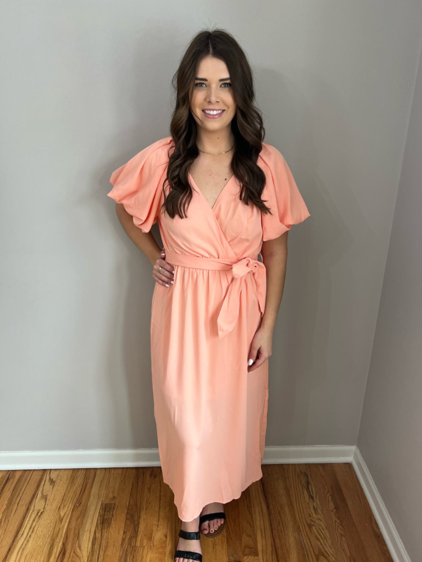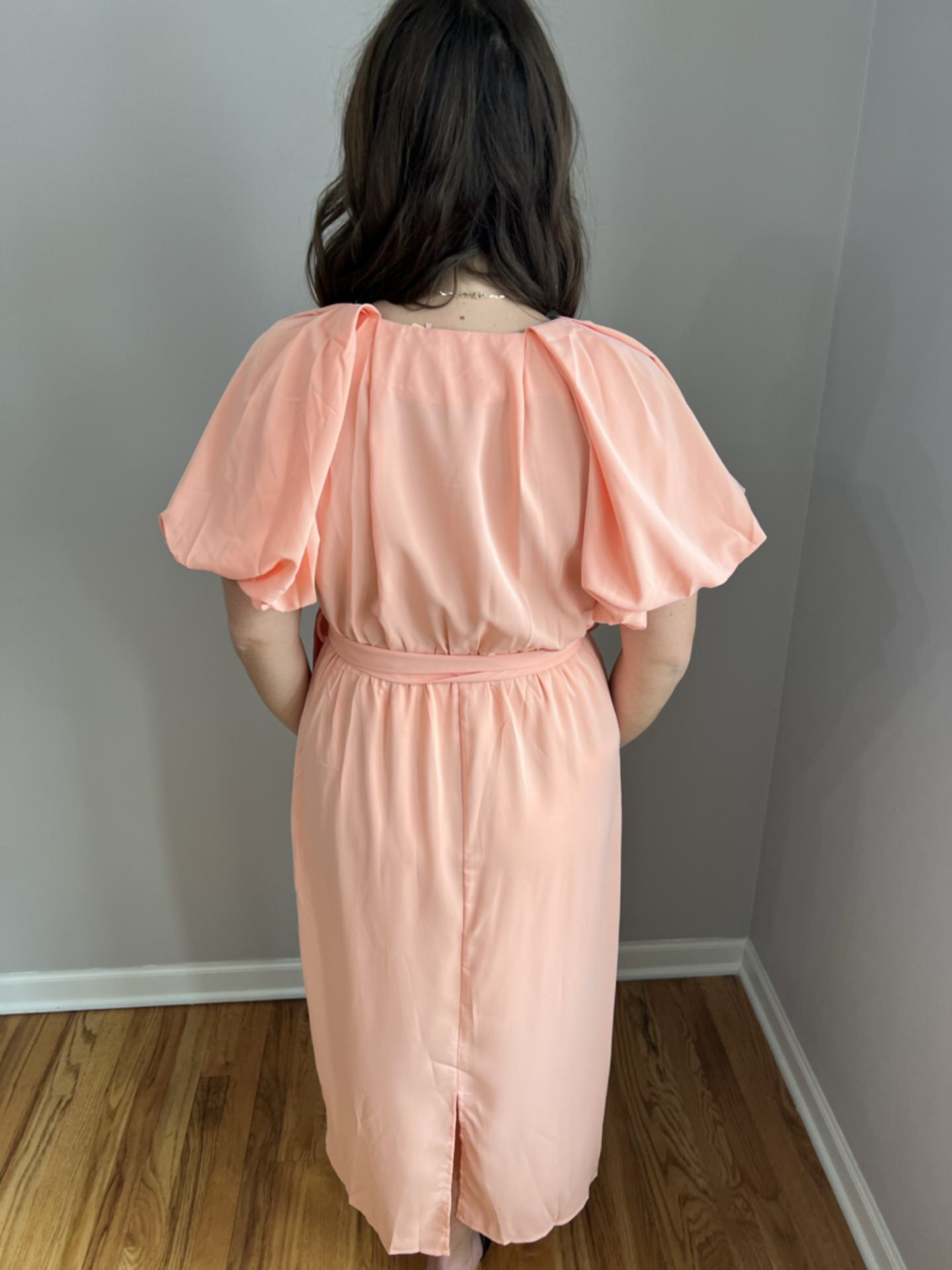 V-neck Puff Sleeve Midi Dress featuring pleated shoulders and self-tie at front. Slit at back skirt. Lined. Woven. Non-sheer. Stretchy Waistband