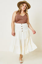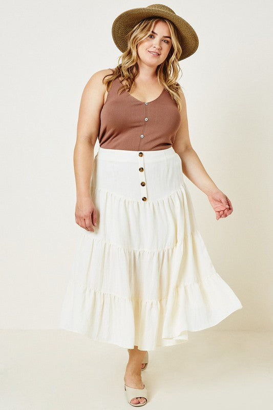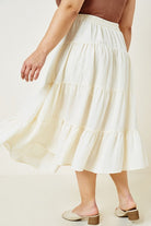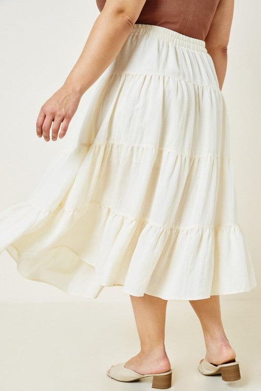 This tiered midi skirt has a lightweight linen-like fabric and a stretch waistline.