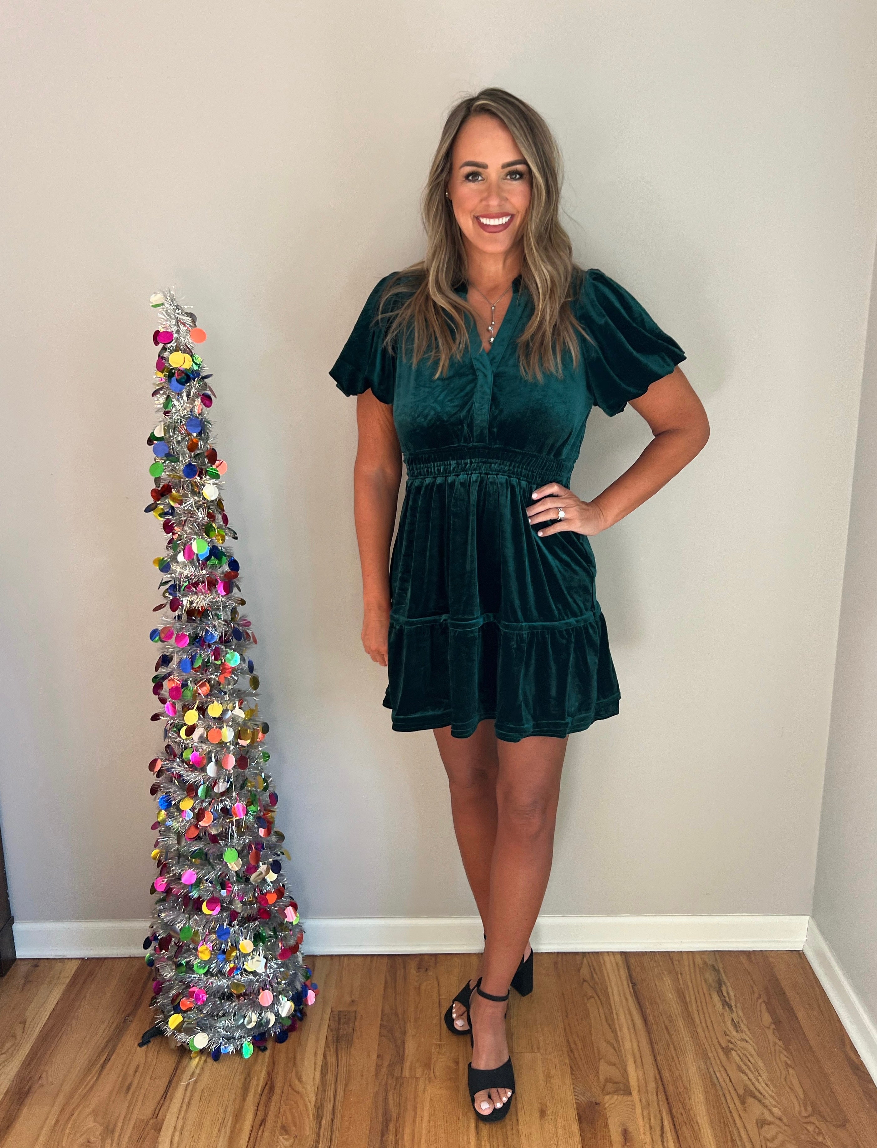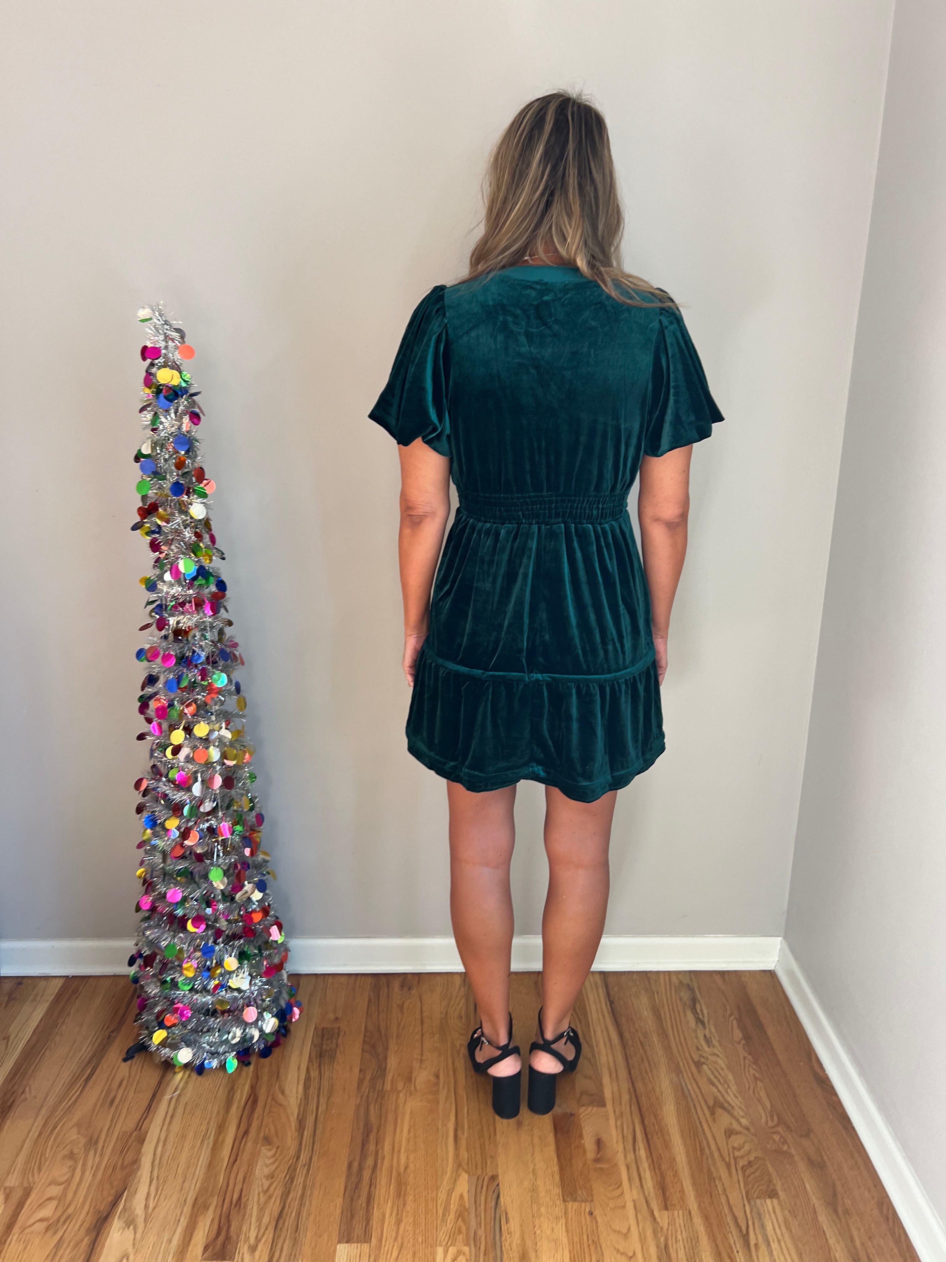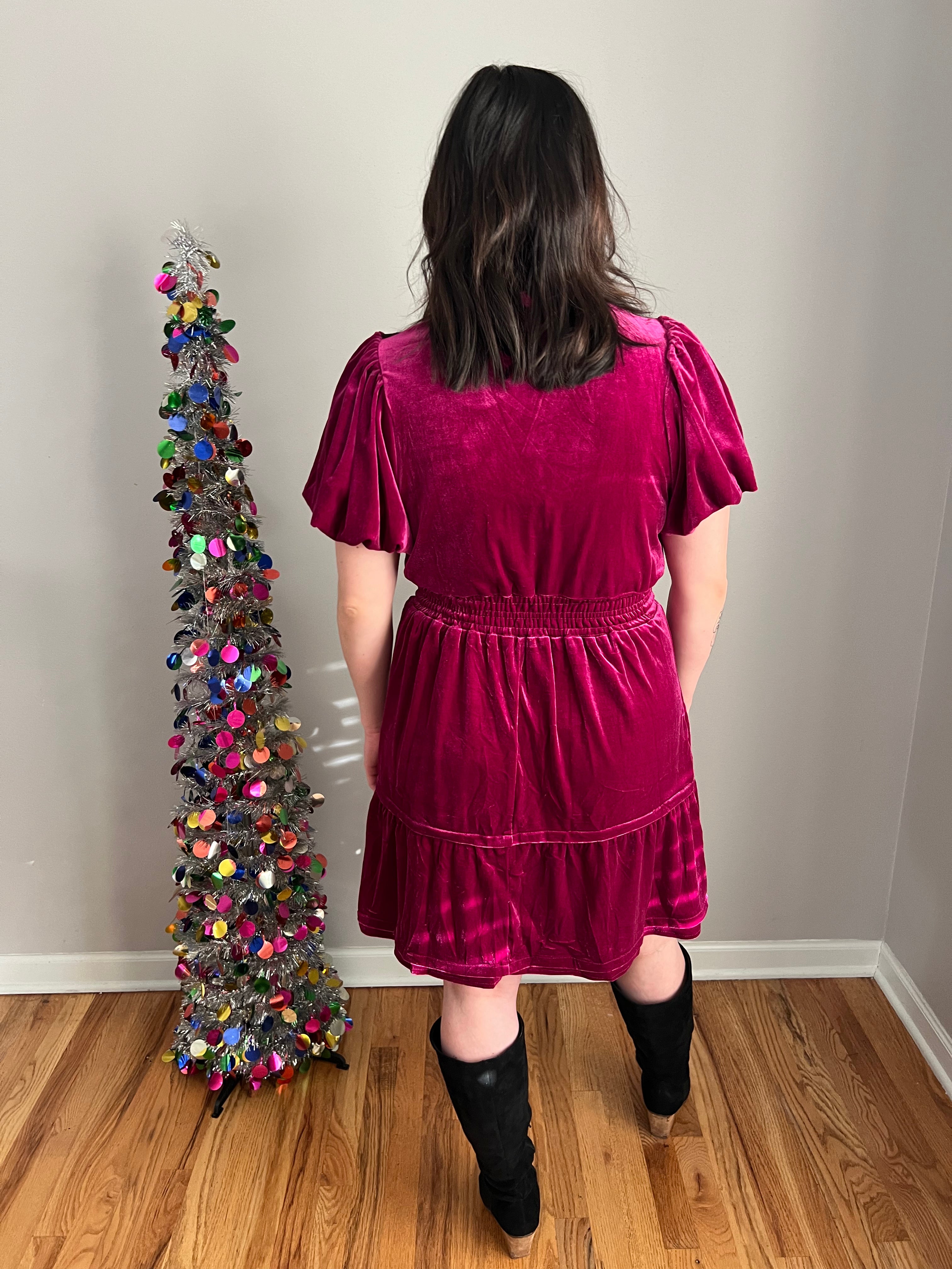 No zipper, easy and fuss free. A cute velvet Holiday look!