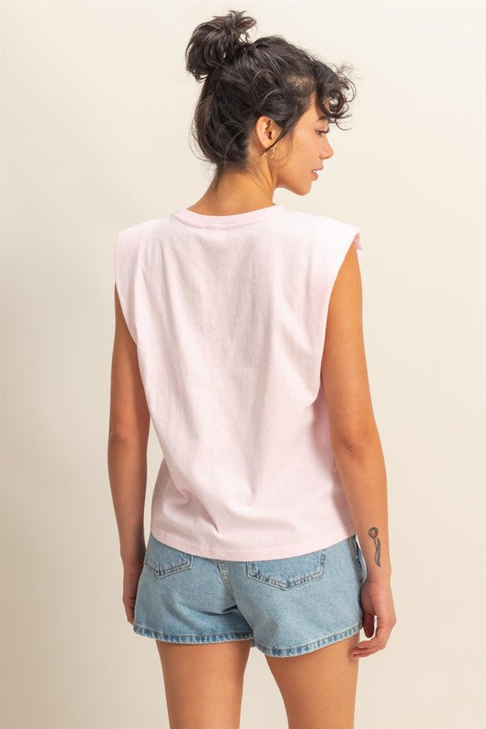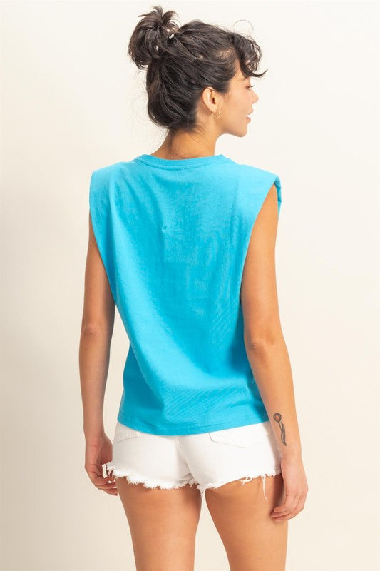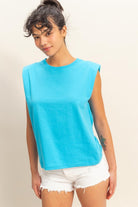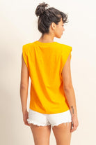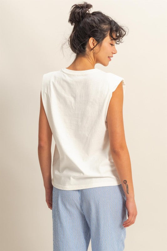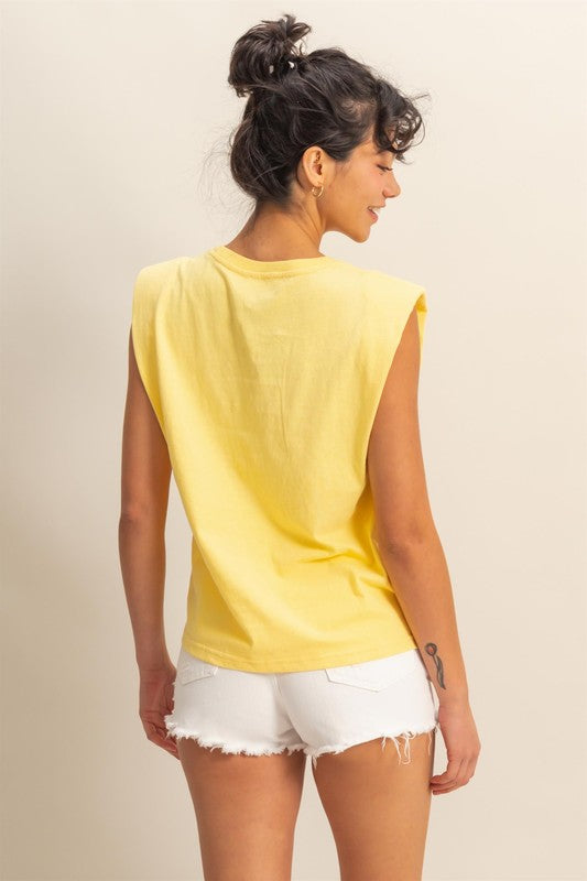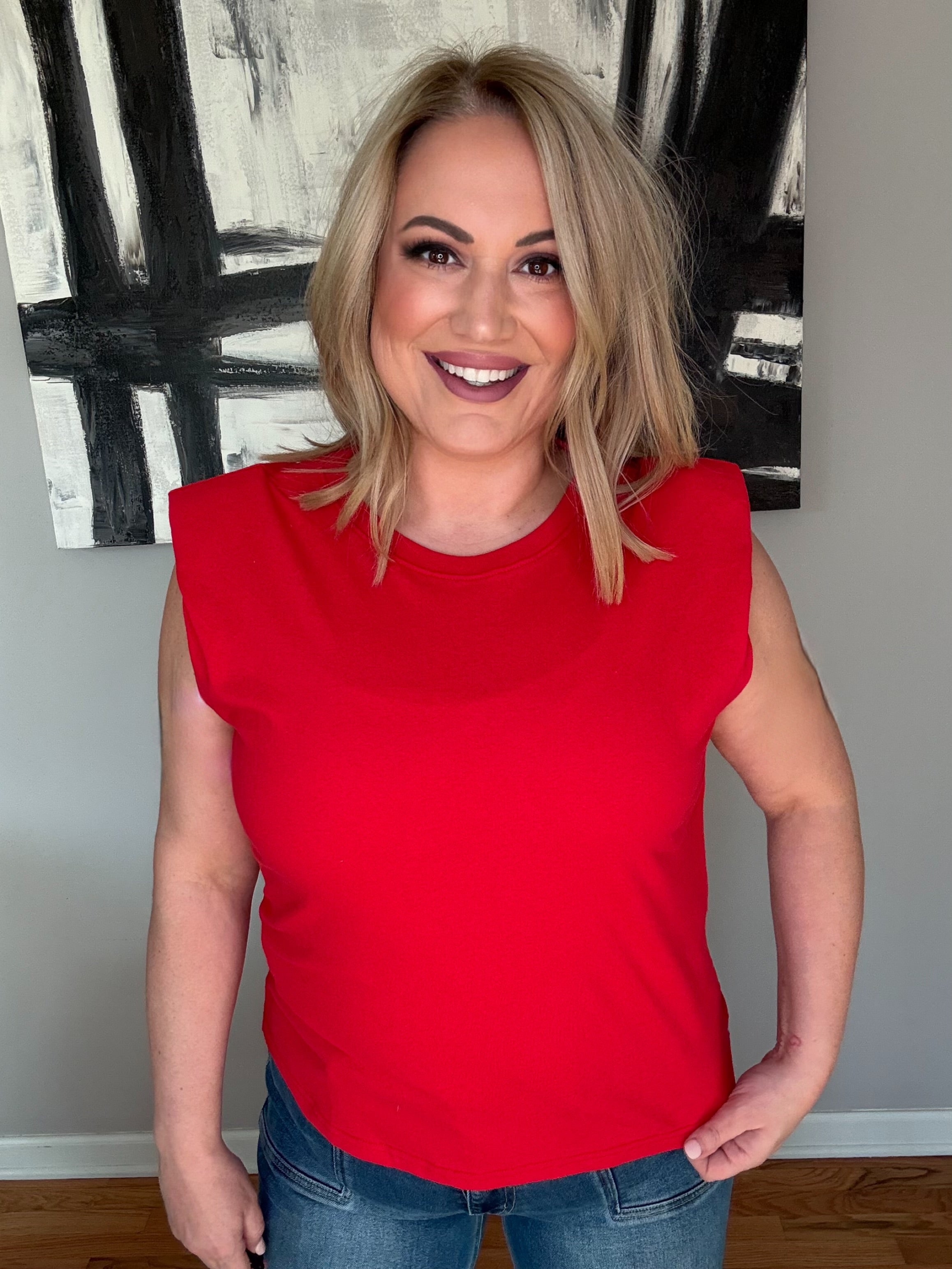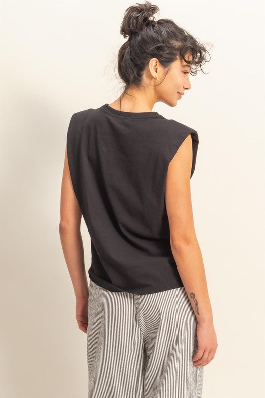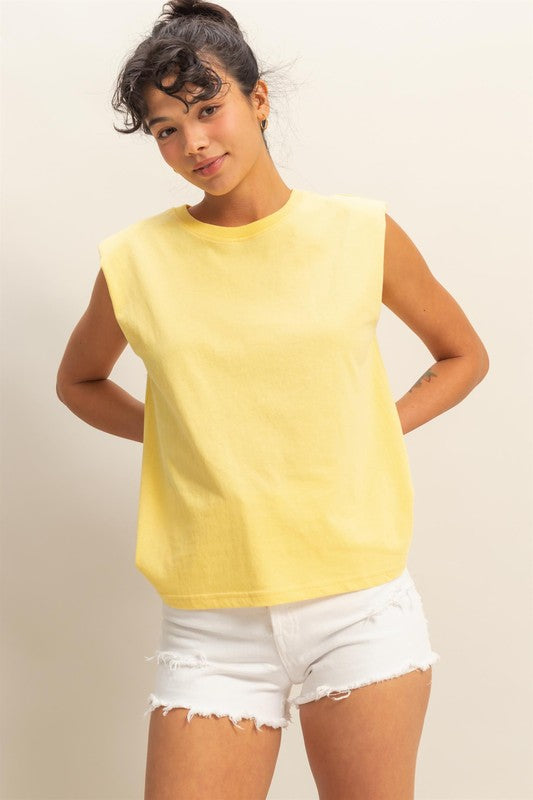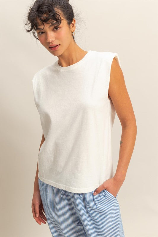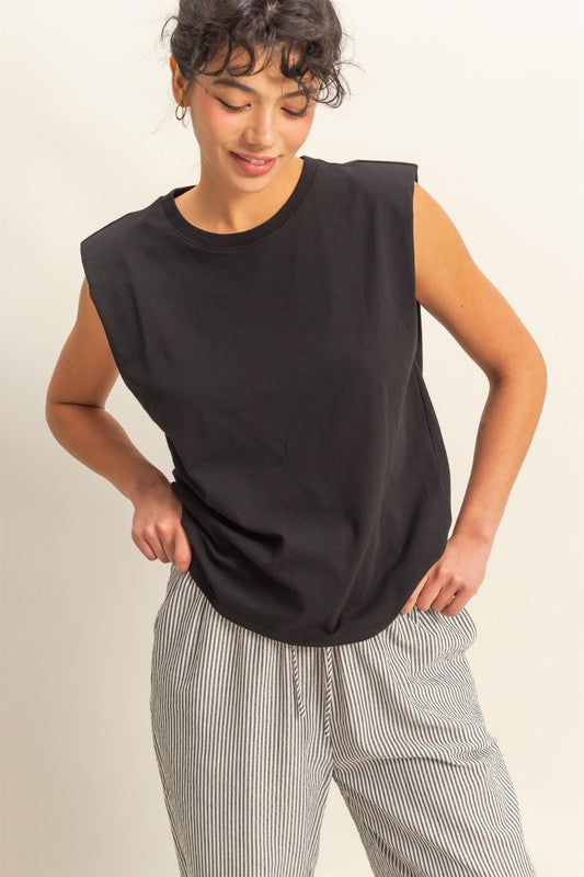 The Shoulder Pad Tank is the ultimate work top. With its chic sleeveless cut bodice, structured shoulder pads, and relaxed silhouette, it creates a polished and professional look. Perfect for pairing with tapered trousers, this top will elevate any work outfit.