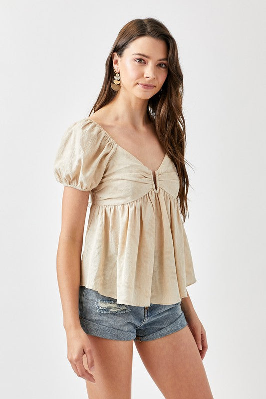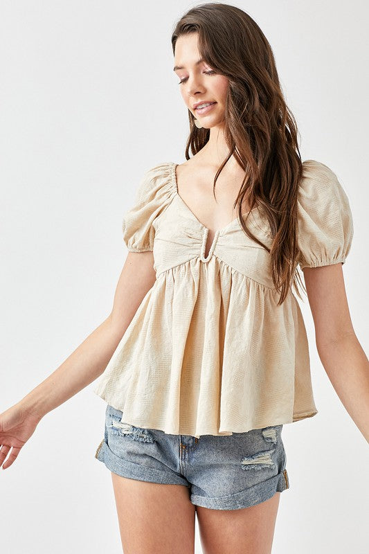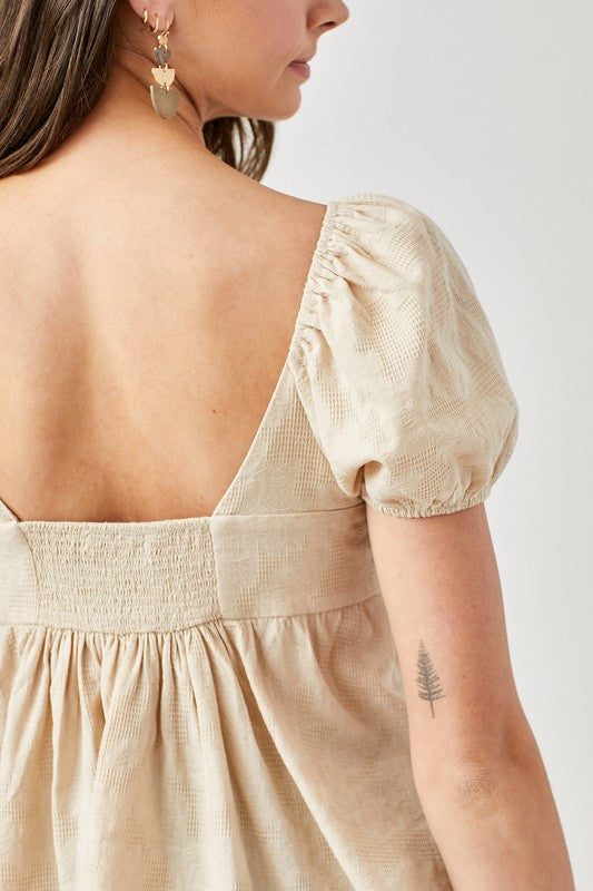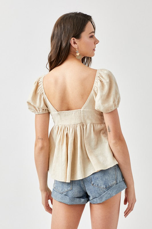 Very fun and flattering top. I love the way it is styled here. Would also look great front tucked into long denim. Smocking in the back for a comfortable fit. Non-sheer. Can be worn without a bra. Fully lined and supports!