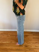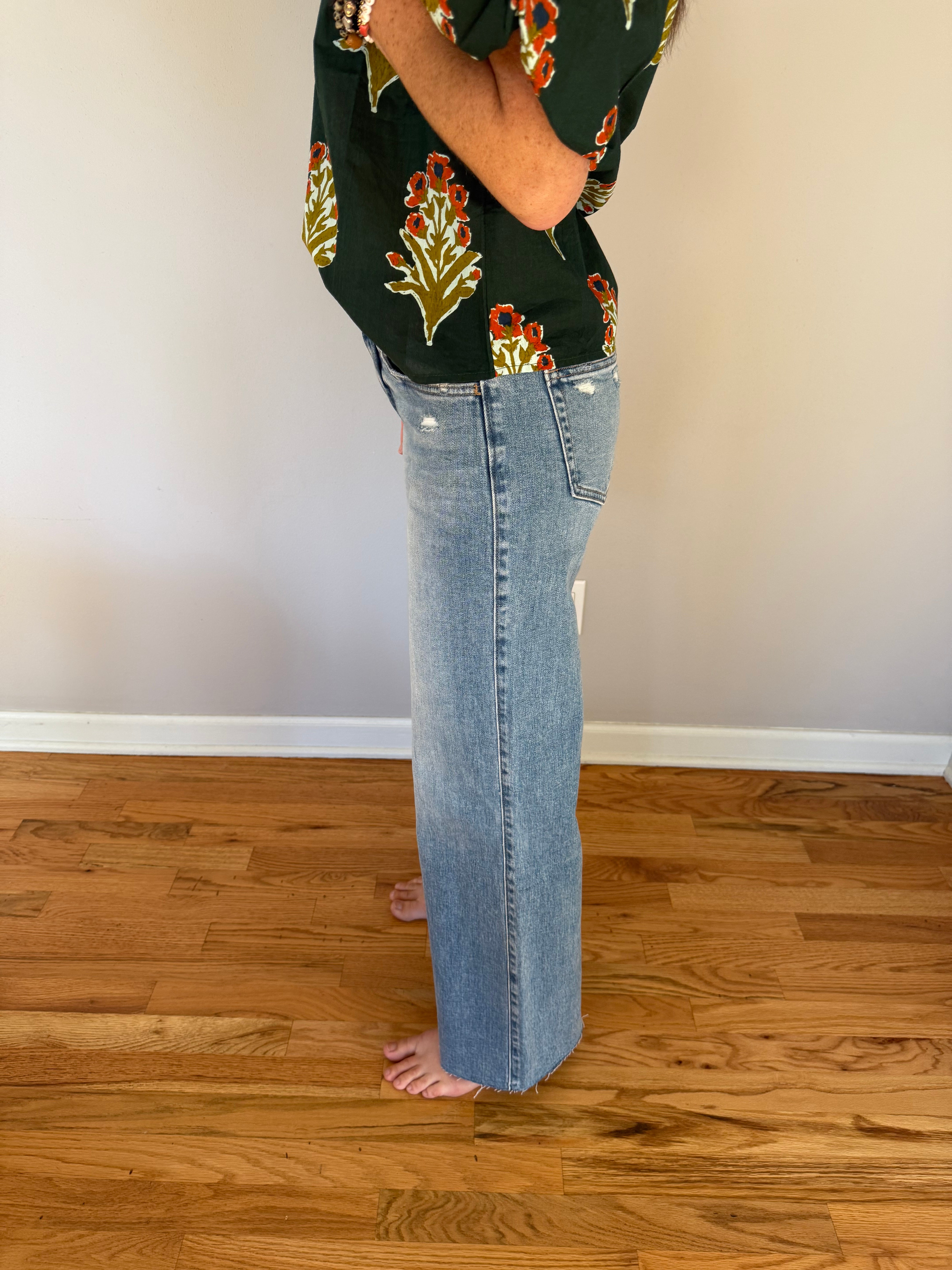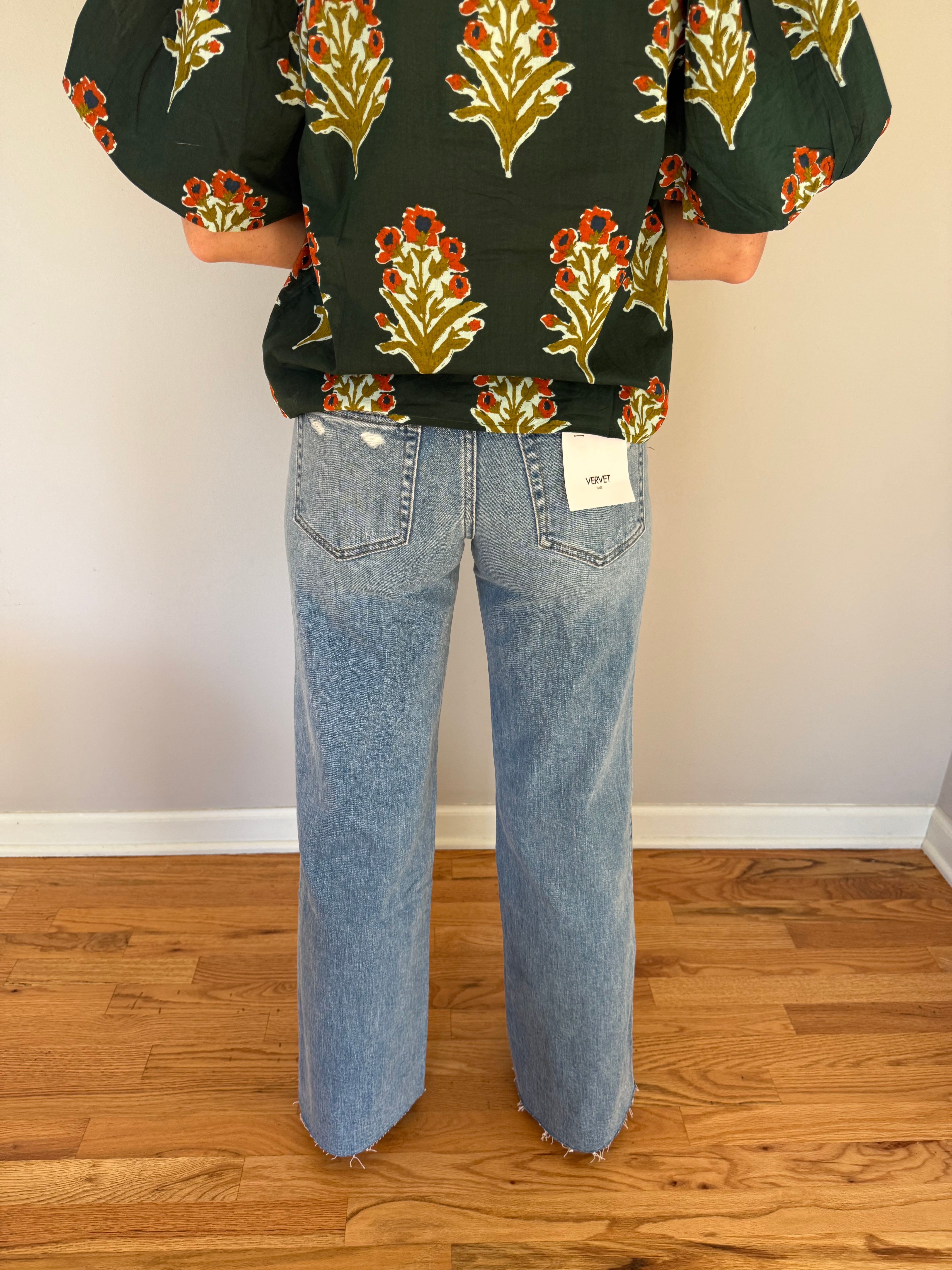 Experience effortless style and comfort with these Vervet mid-rise wide jeans, crafted from comfort stretch denim for ease of movement. Featuring a medium wash and lightly distressed details, they deliver a modern yet timeless look. The clean cut raw hem adds an understated edge, while the full-length wide leg silhouette offers a flattering, relaxed fit. Five practical pockets complete the design, making these jeans a versatile staple for any wardrobe.