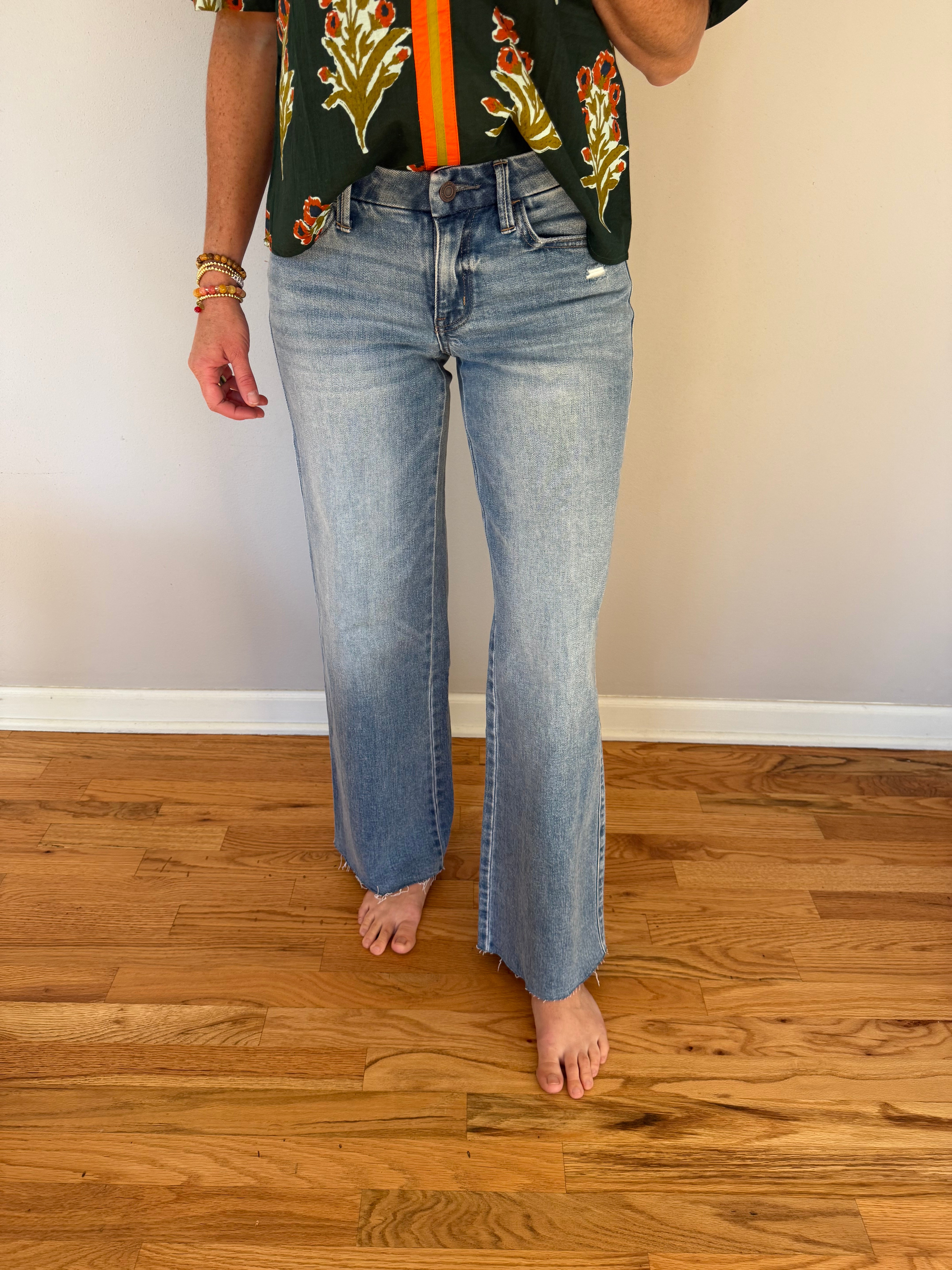 Vervet Mid Rise Medium Wash Clean Cut Raw Hem Wide Jeans
